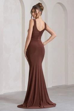 Who says the bride can solely bring the drama? Our latest maxi dress known as Adele is crafted from premium ruched jersey in a creamy brown hue. A plunging back is supported from delicate straps which can be adjusted for the perfect fit whilst a fishtail skirt showcases a godet train from behind.