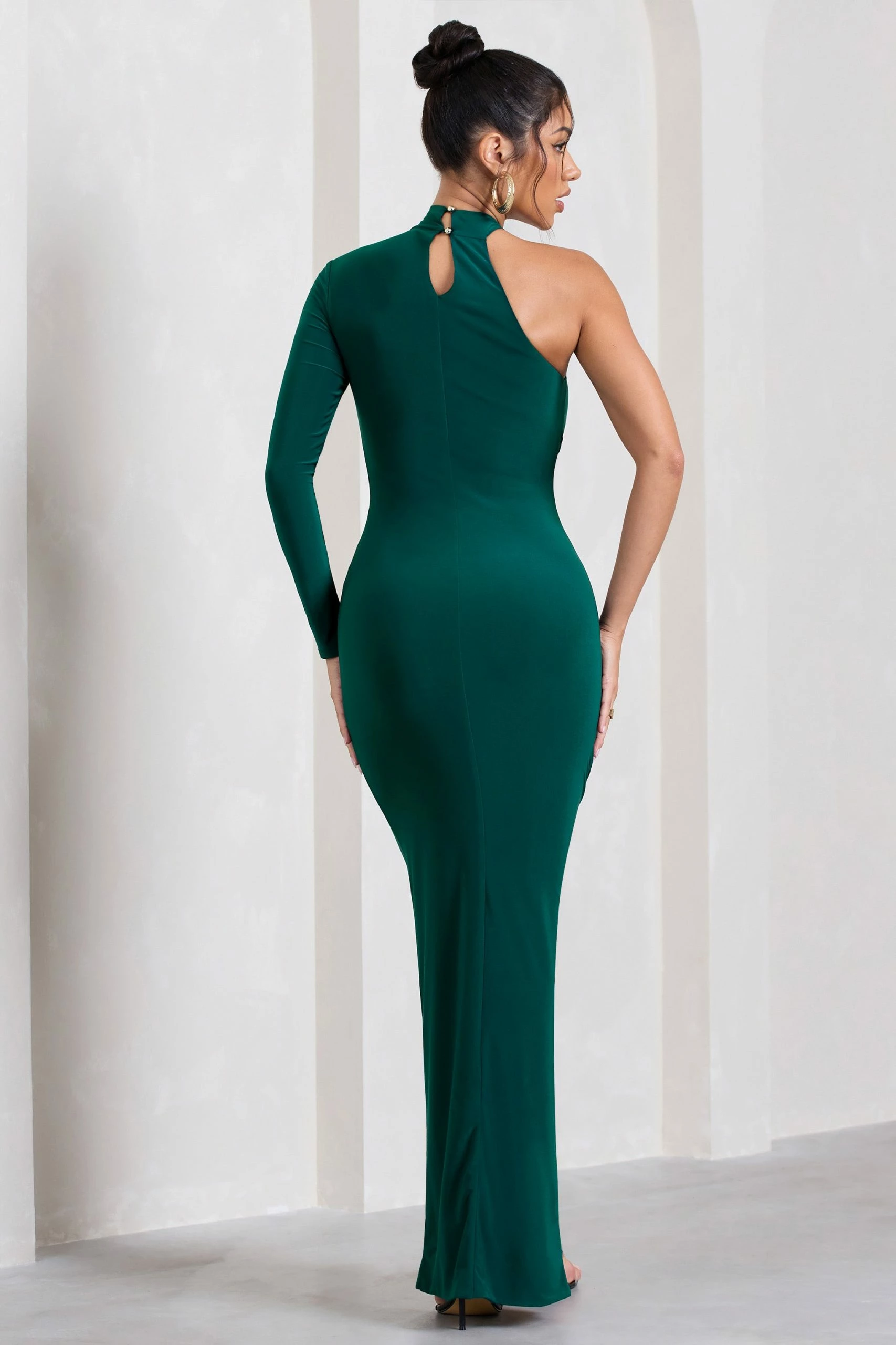 Sophisticated in both shade and silhouette, Alina is a classic choice for your next romantic date night or race day event. This green maxi dress features a high neckline that falls into a contemporary one-sleeve design, before finishing with ruching to carefully cinch your waist.Â