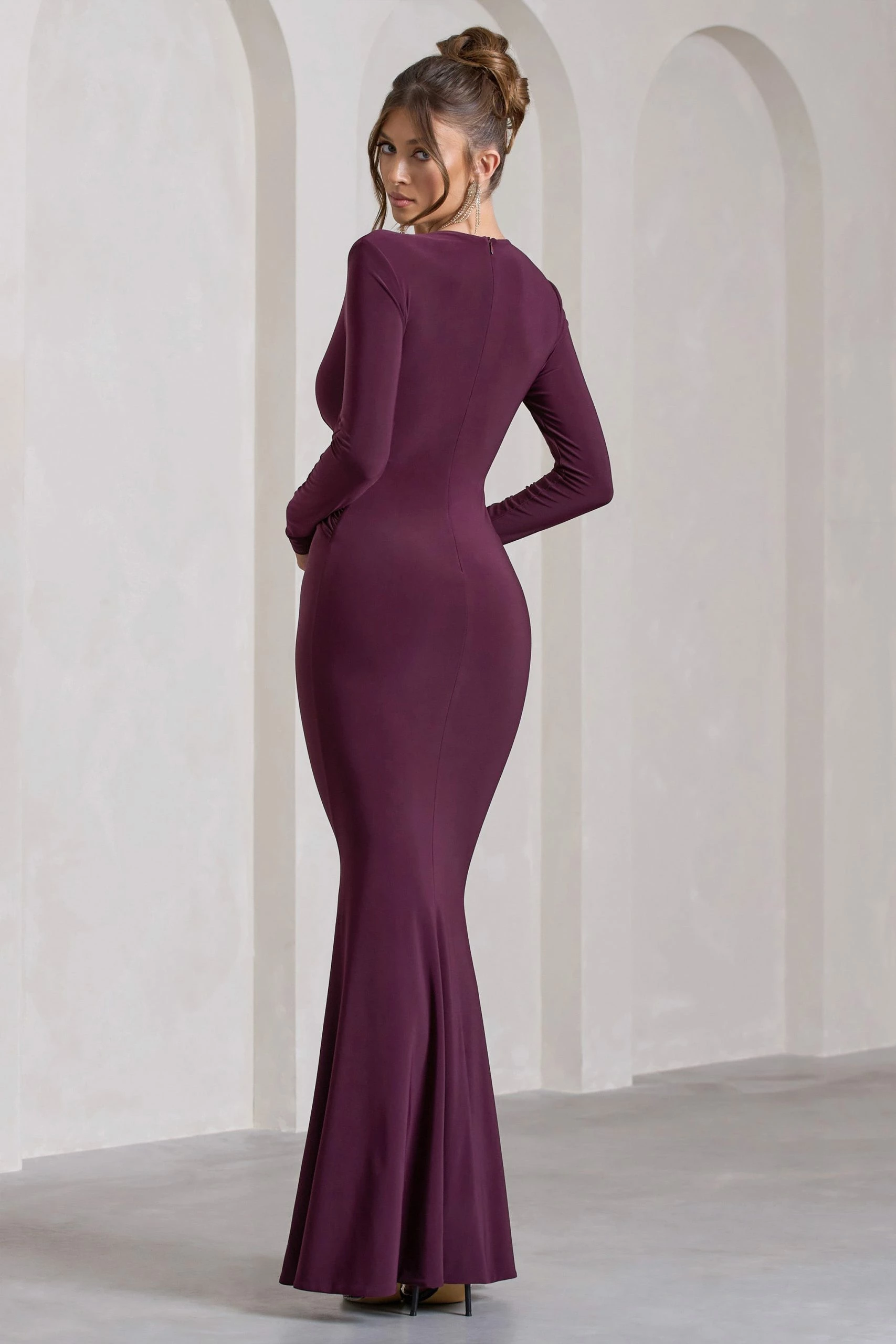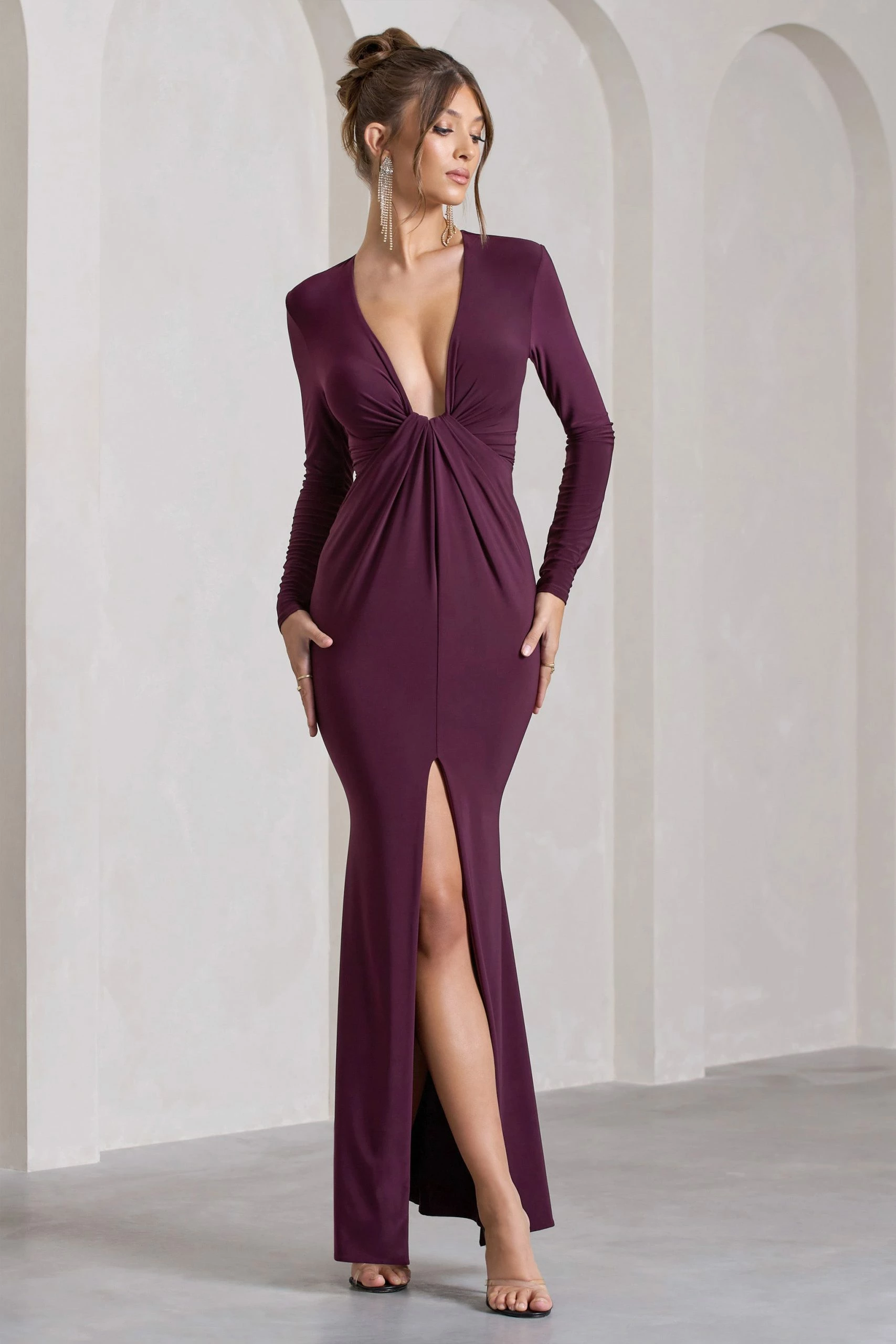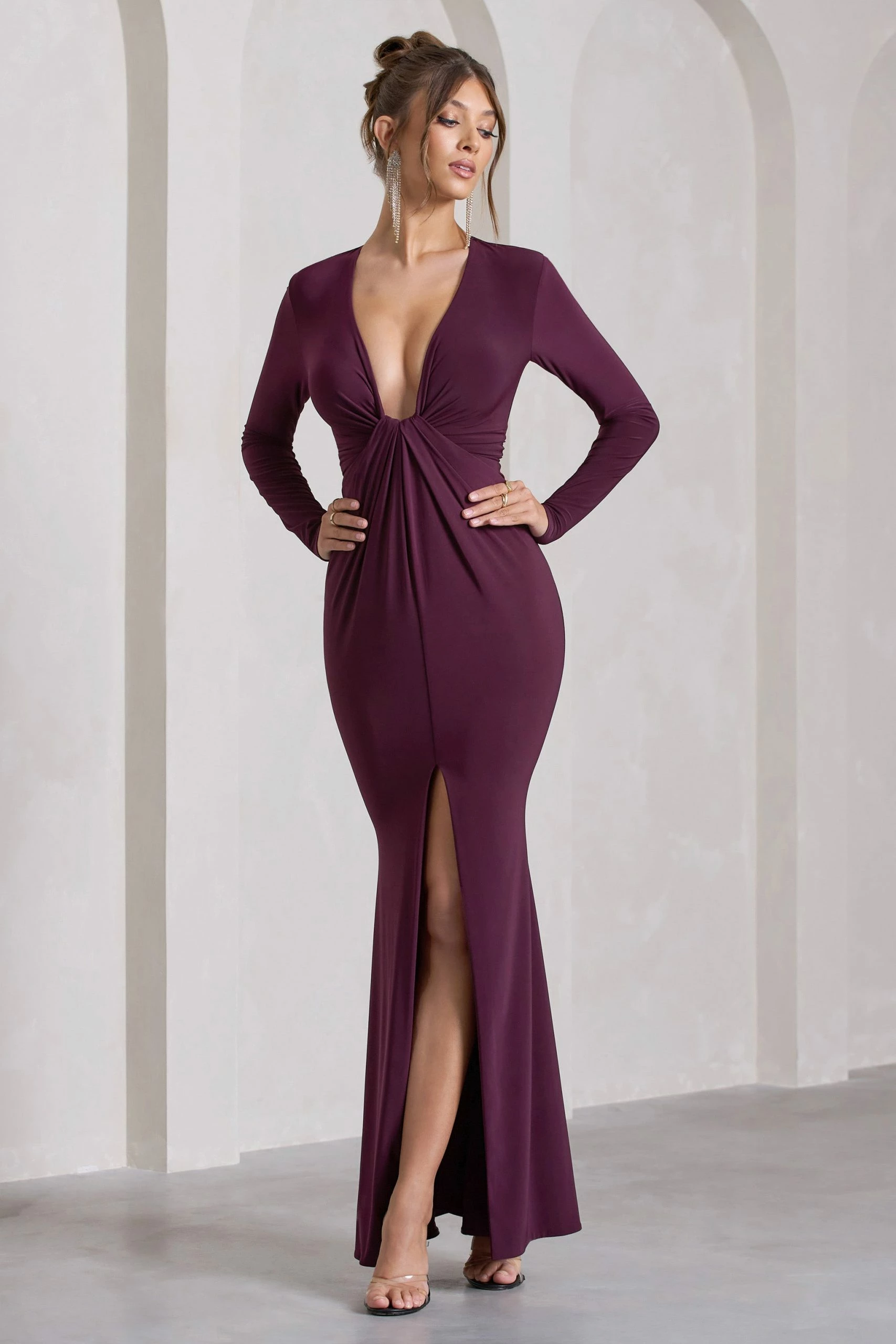 Exude effortless elegance with Aluna, a formal wardrobe must-have. Designed in a premium stretch jersey known for its sculpting capabilities, this plum maxi dress is defined by a curve-hugging knot that carefully cinches your waist. Complete with an alluring high-leg split, Aluna would make an elegant choice for an upcoming wedding event.Â