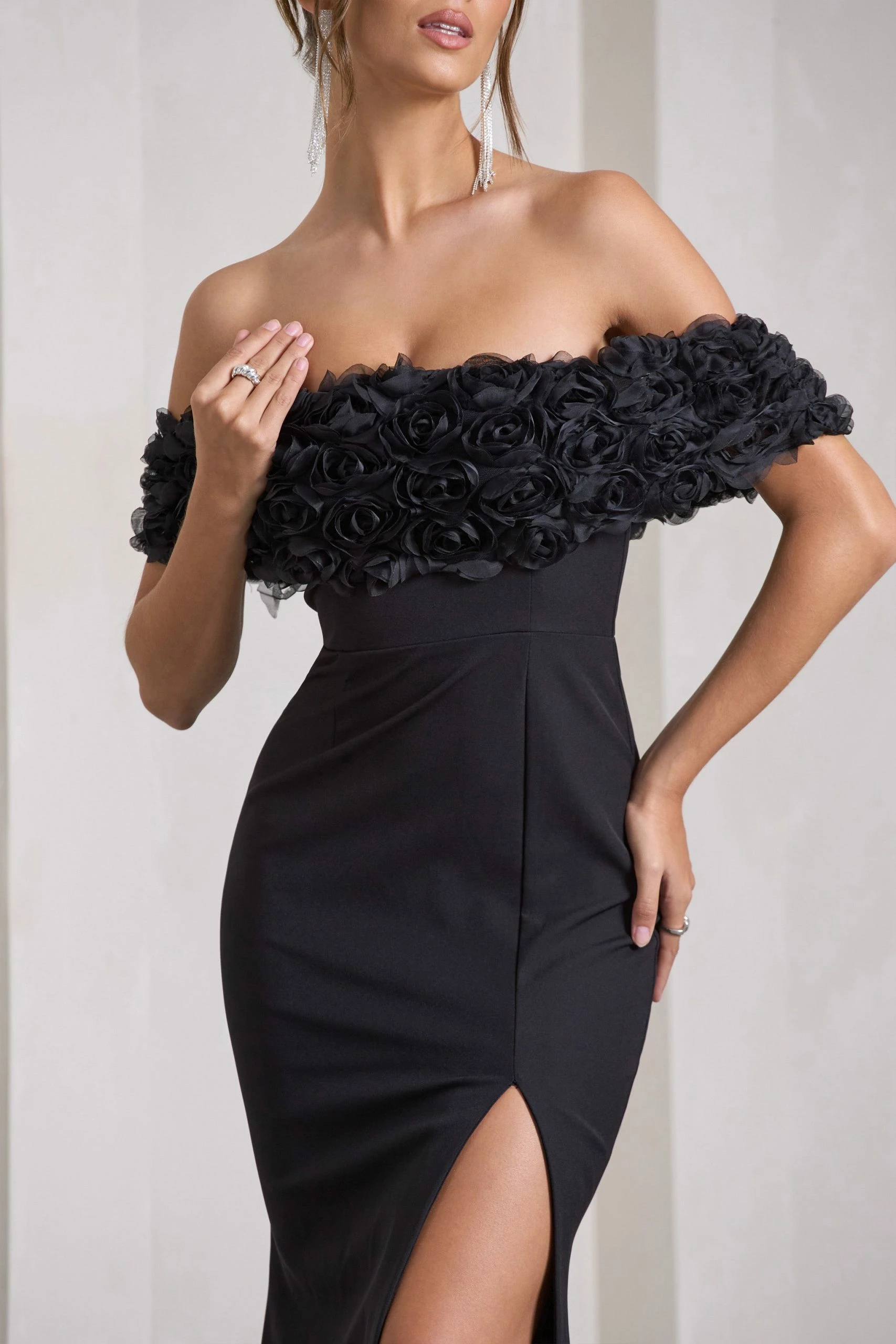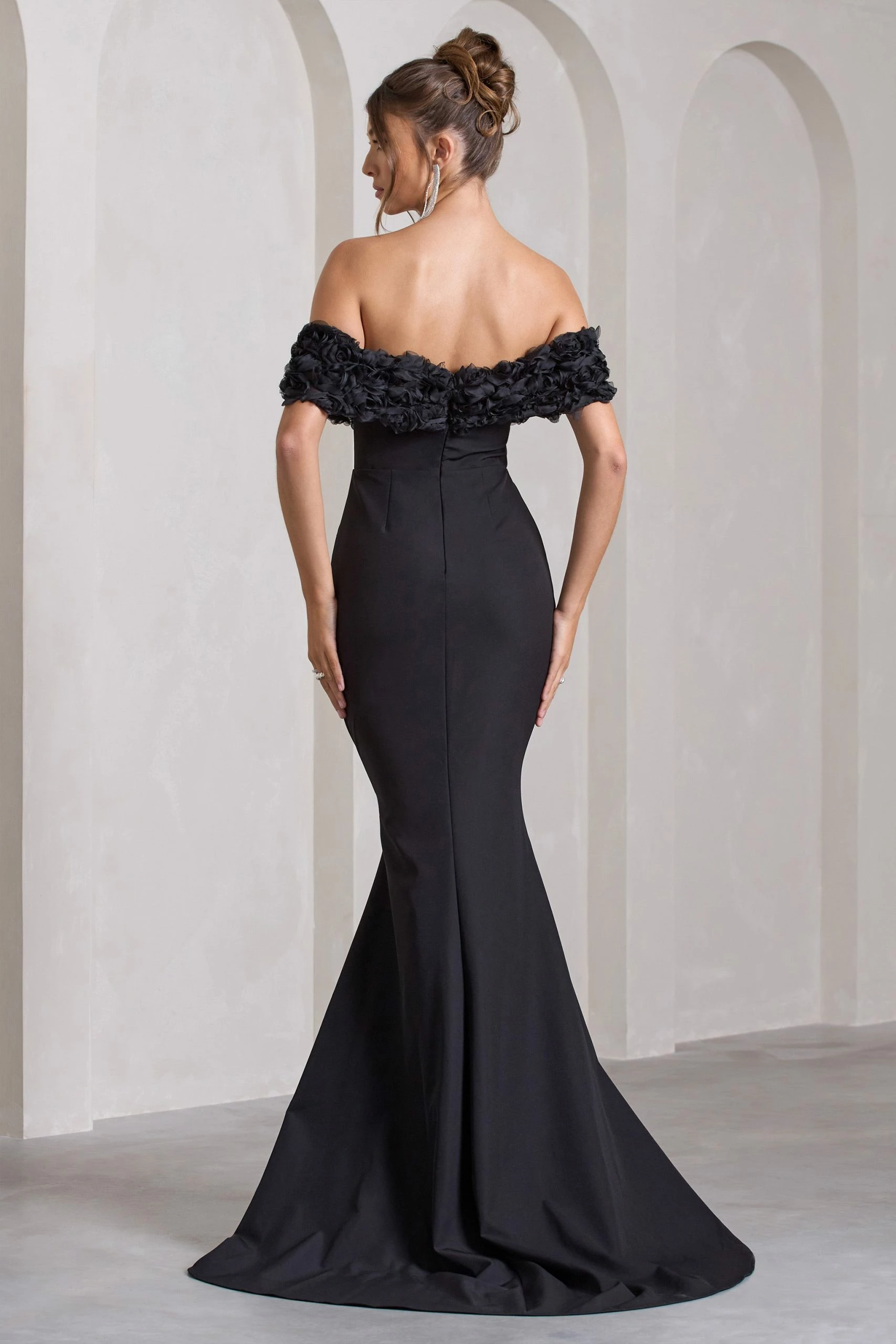 Whether you’re attending a black tie gala or wedding event, Amanza is an elegant choice. Defined by a captivating floral bardot neckline, this black maxi dress is designed in a premium stretch crepe accompanied by waist darts to enhance your figure. Flourished with a split fishtail skirt, team yours with some strappy stilettos to enhance your look.Â