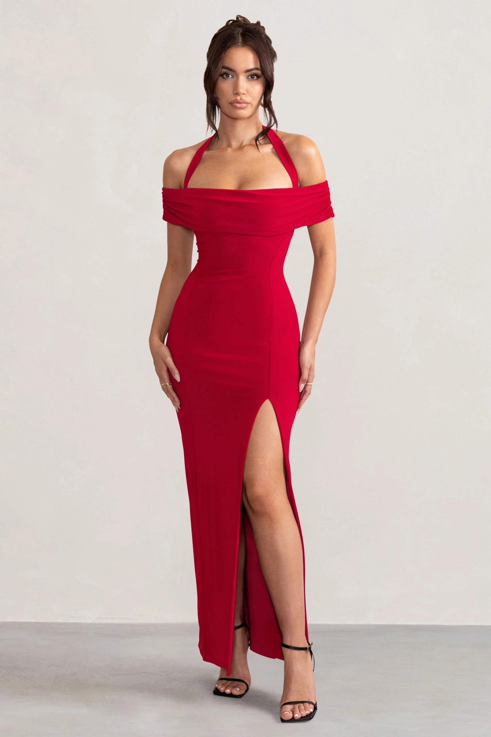 Be the first to review “Anisa | Red Layered Halter Neck Bardot Maxi Dress With Thigh Split” Cancel reply