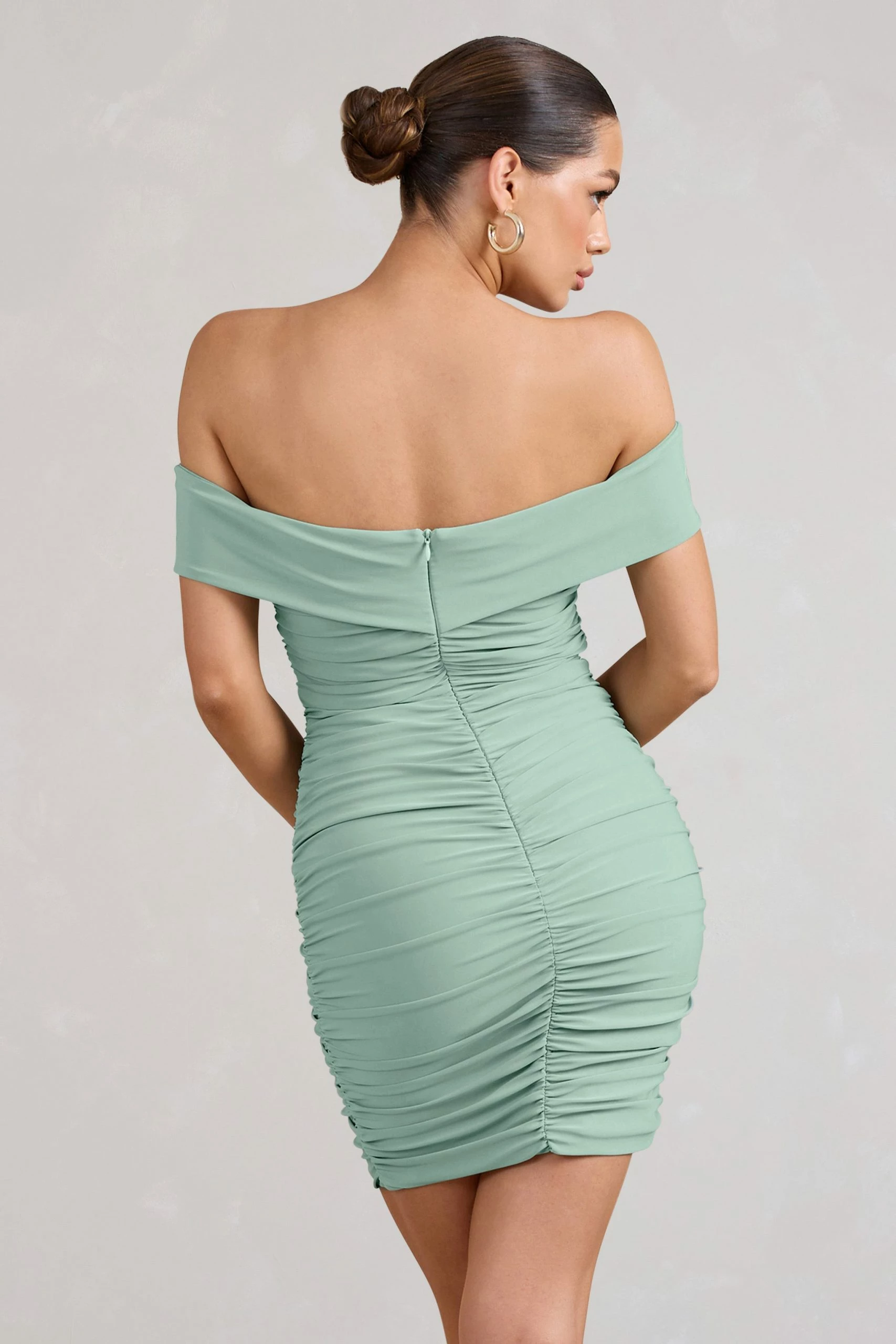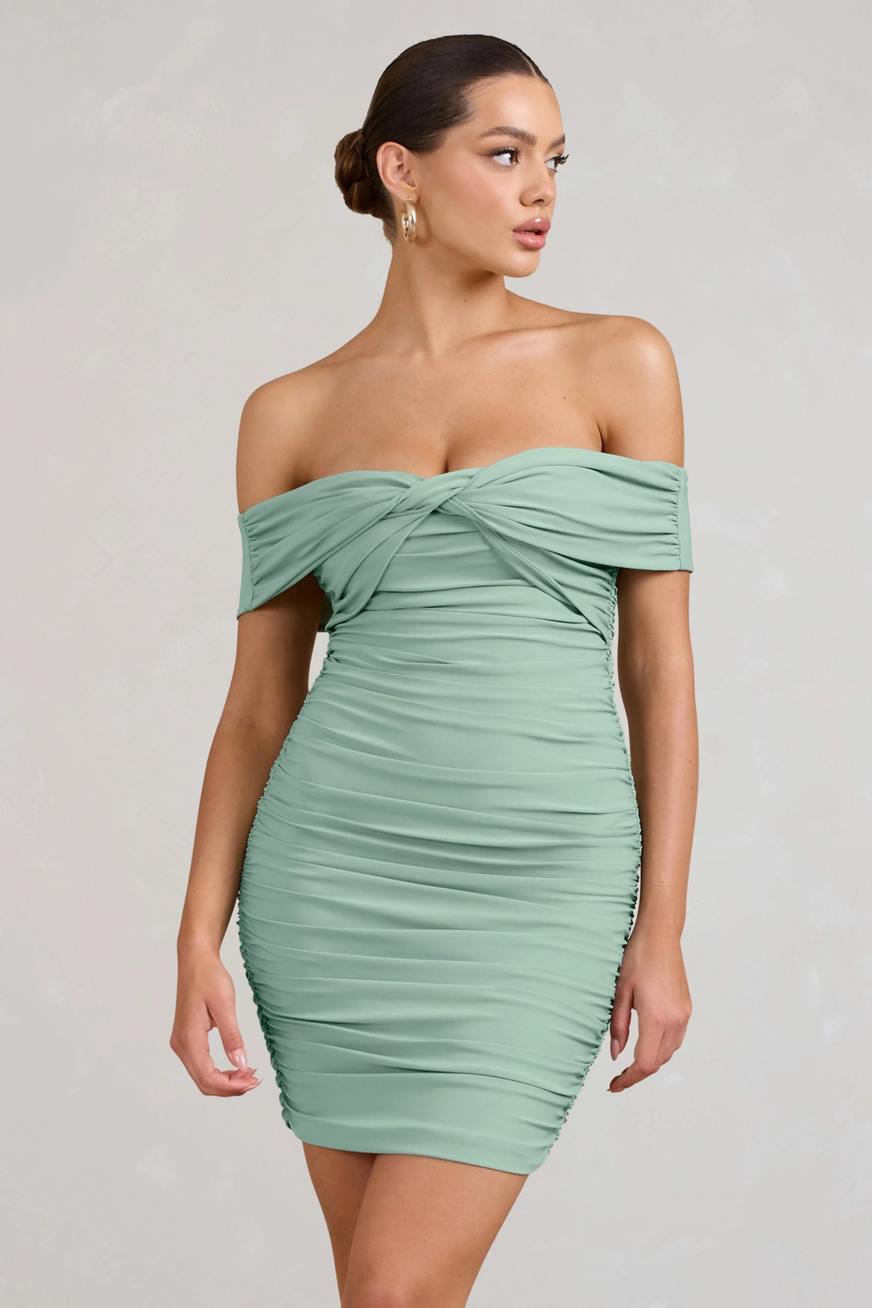 Show some appreciation for your feminine curves in a sculpting mini dress like this aptly-named option. Designed in Club L’s signature stretch jersey, known to enhance our favourite assets, this ruched sage green dress features a twisted Bardot neckline that rests off both shoulders and a flattering bodycon fit.