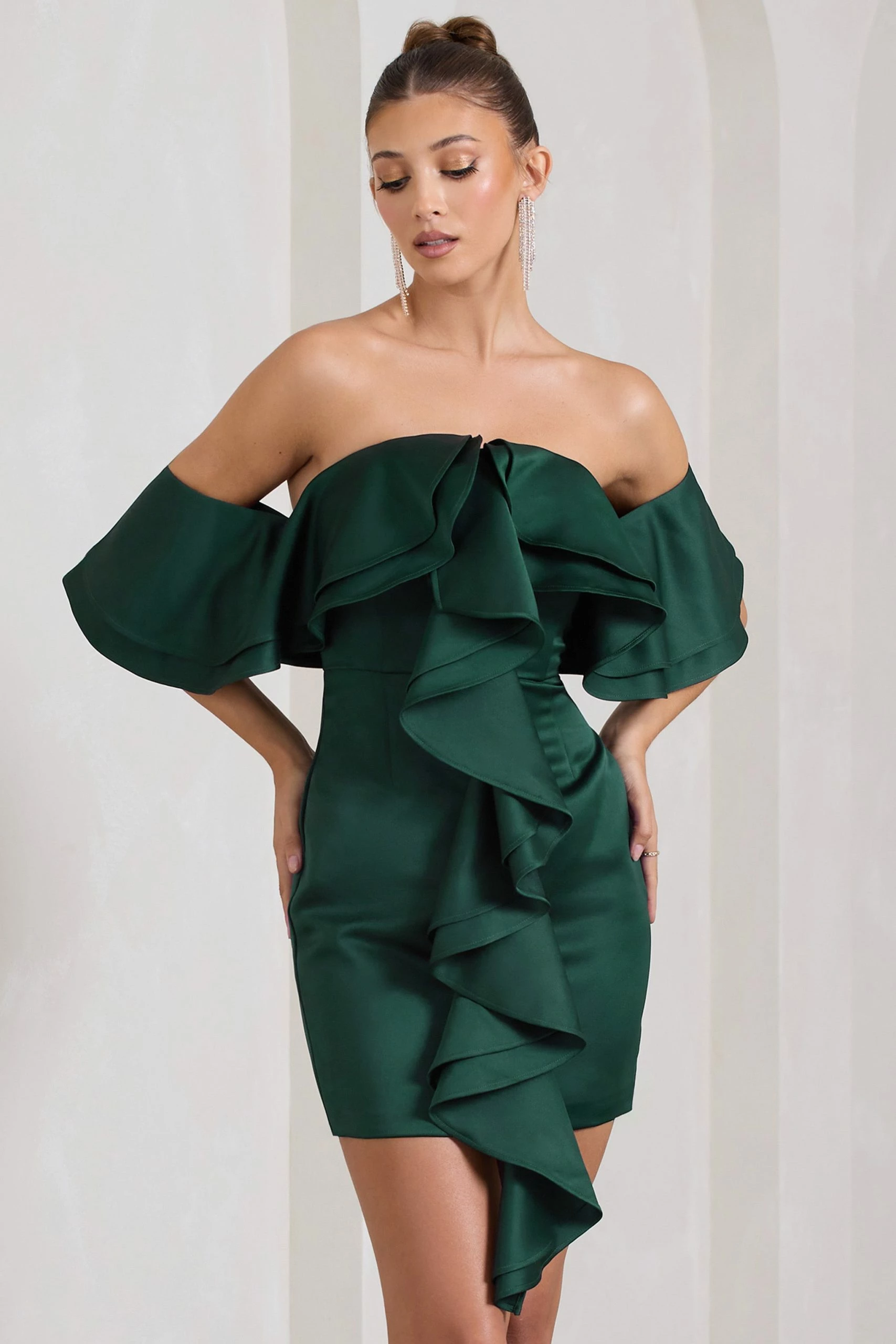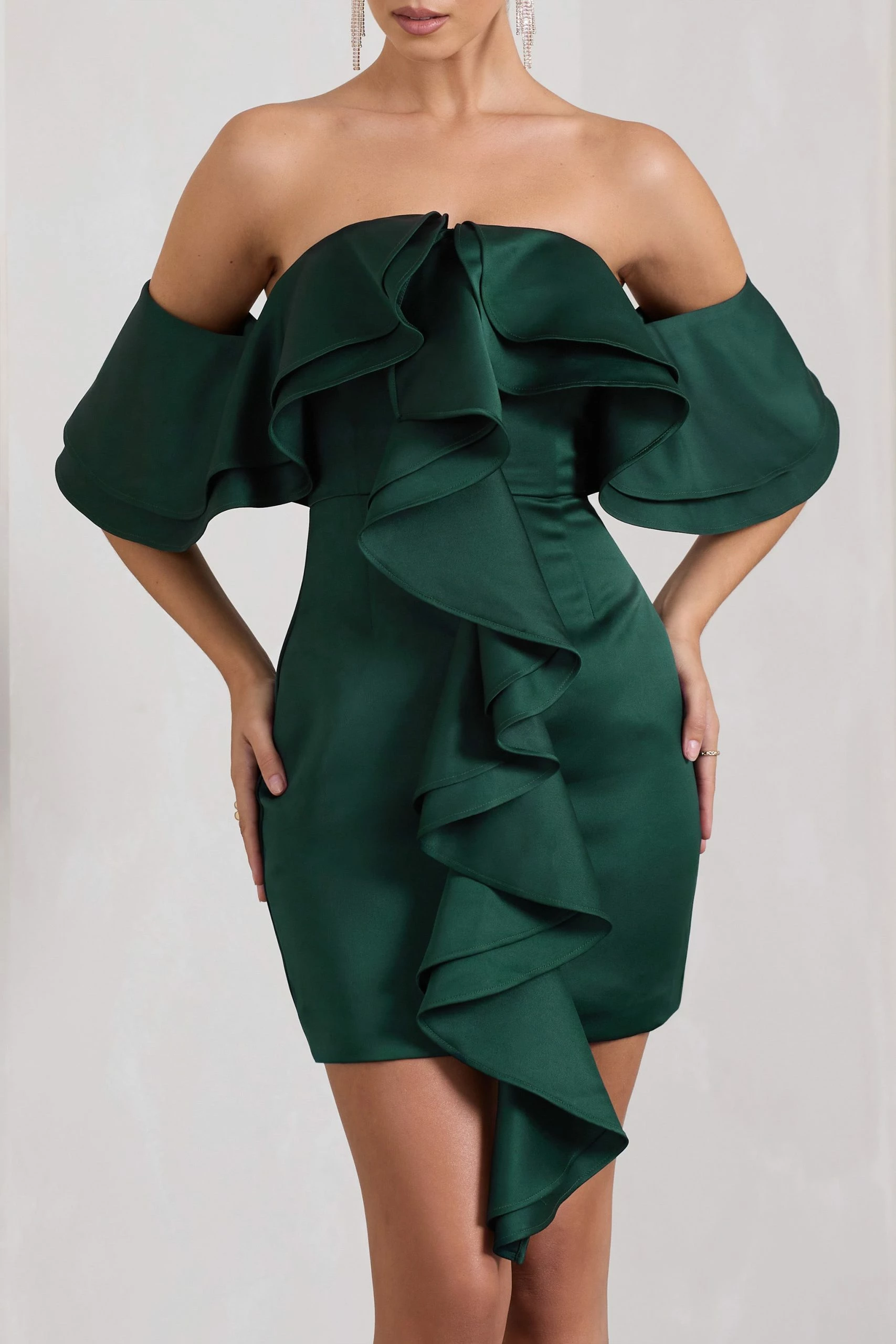 Defined by cascading ruffles, Aspen has everything you need to stand out from the crowd. Arriving in a rich bottle green shade of our premium heavy satin, this bardot mini dress is an enchanting option for any upcoming birthday soirée or cocktail party. Give Aspen‘s neckline the attention it deserves by styling it with a sleek bun at your next event.Â