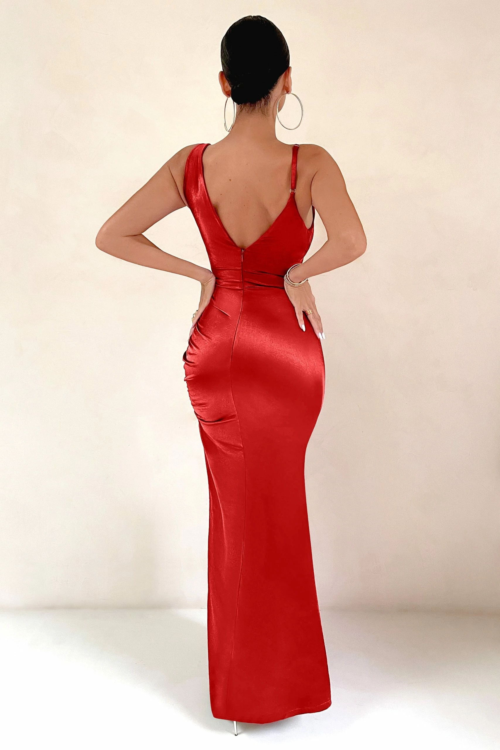 Our latest satin slip dress Belonging certainly belongs in your wardrobe this season, boasting an asymmetric silhouette with a draped cowl neckline and one single cami strap. Accentuating your curves with delicate side ruching, this red maxi dress would suit any special occasion from date nights to destination weddings.