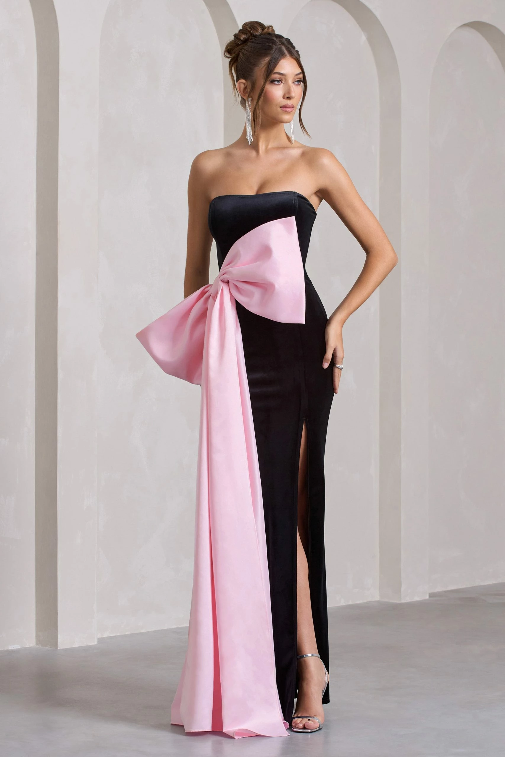Introducing the dress of the season, Best Wishes. Arriving in a sumptuous black shade of our signature stretch velvet, this strapless maxi dress portrays a timeless silhouette thats elevated by a show-stopping pink satin bow. Effortlessly elegant, keep Best Wishes at the forefront of your next occasion by styling yours with a sleek bun and some matching stilettos like Blade.Â