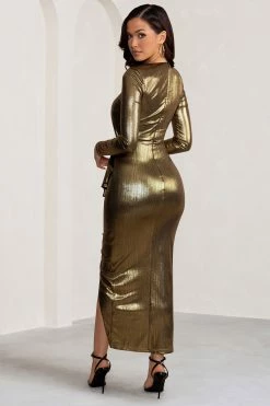 Larsa | Gold High Neck Maxi Dress With Shoulder Pads And Side Ruffle Detailing