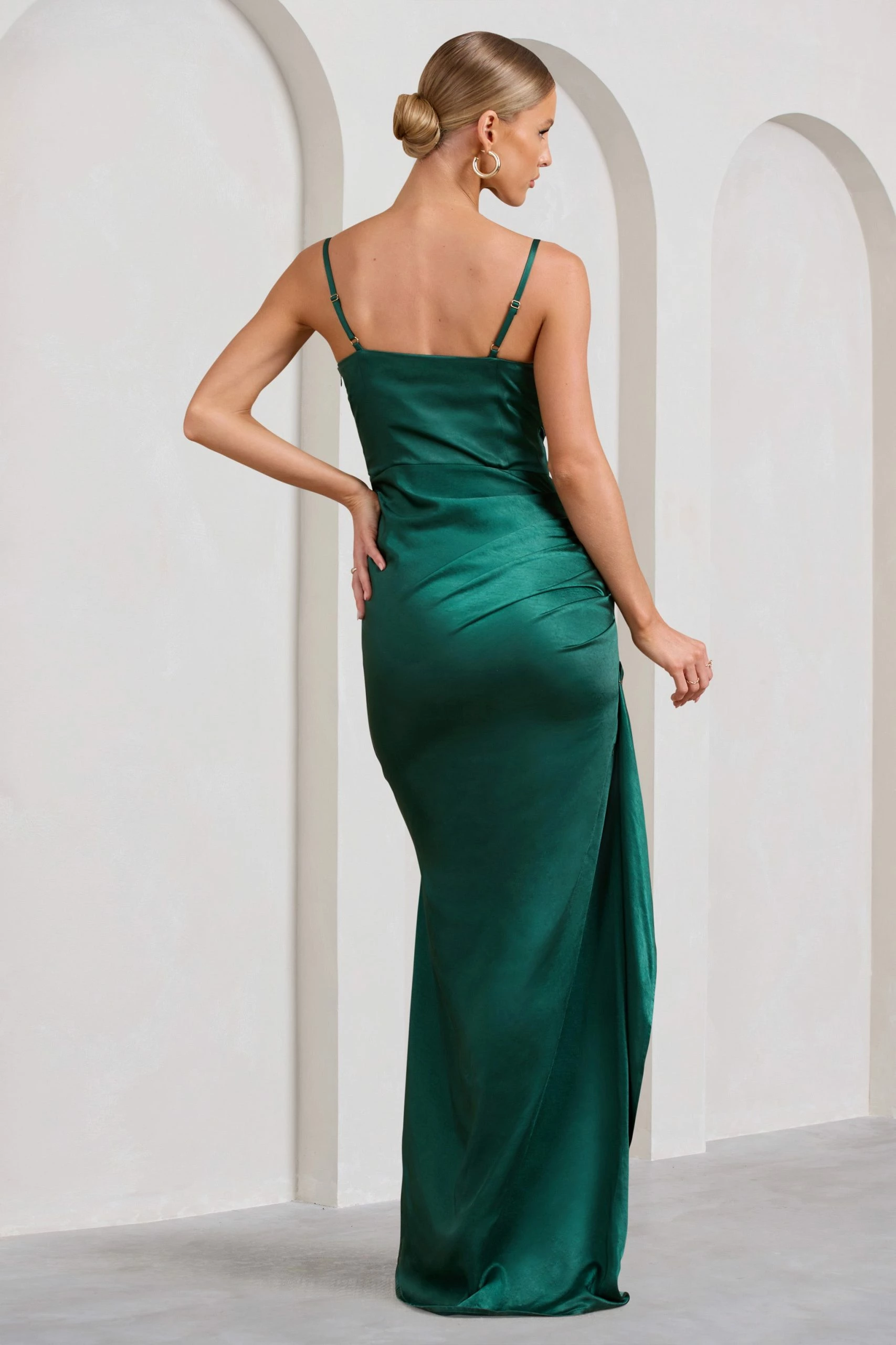 To make an opulent entrance into weddings and special events this season, you need a satin maxi dress like Buckingham. Radiating your figure with its pearlescent finish, this deep green dress carries meticulous pleats from a structured balcony bodice into a sweeping split skirt.