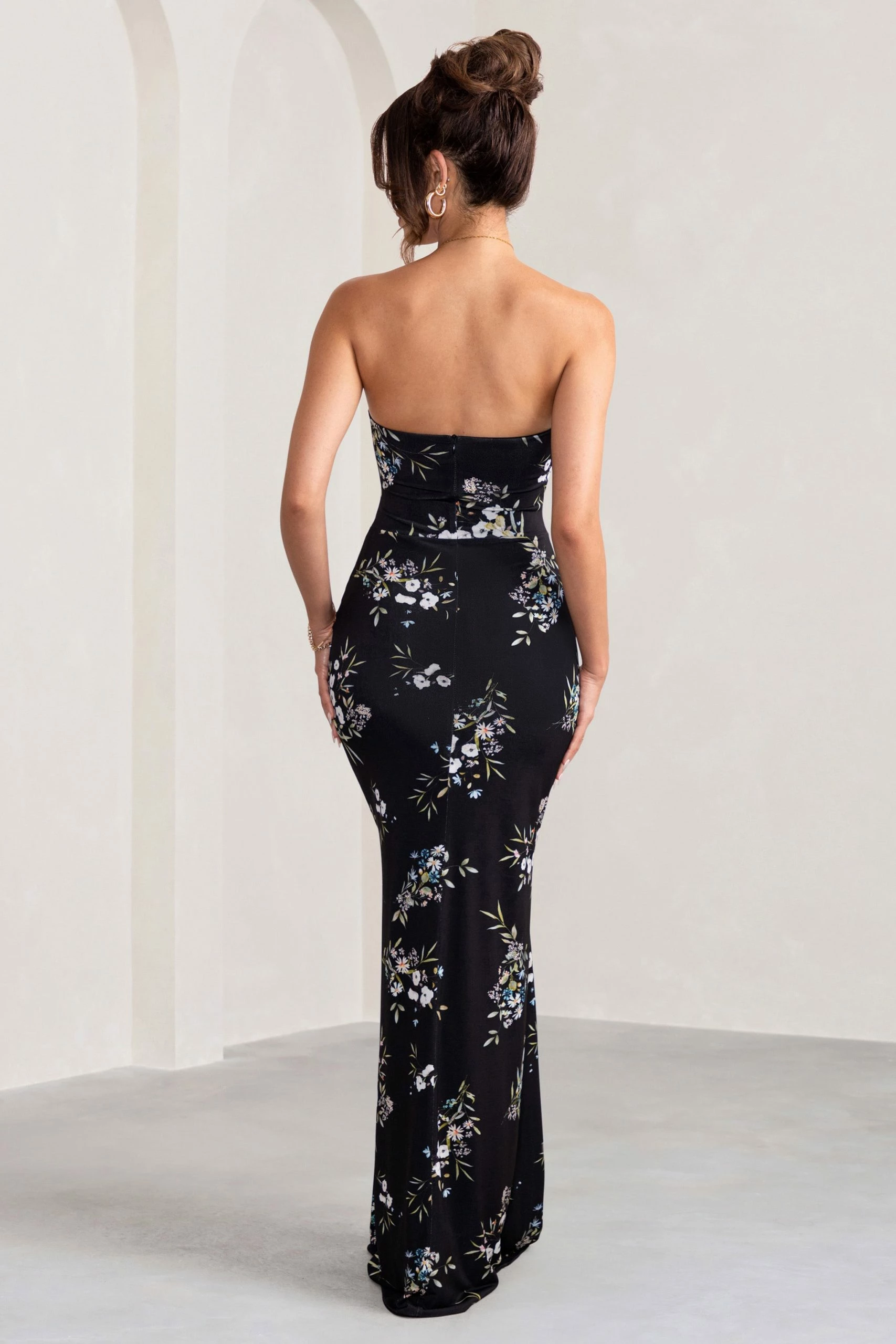Boasting a sleek strapless silhouette, Camila is the sophisticated maxi dress suited to every special occasion. This luxurious evening option arrives in a florally-printed stretch jersey that’s designed to contour your curves with ease. Finished with a striking thigh split, this black bodycon dress would look especially elegant styled with tousled hair and understated heels.