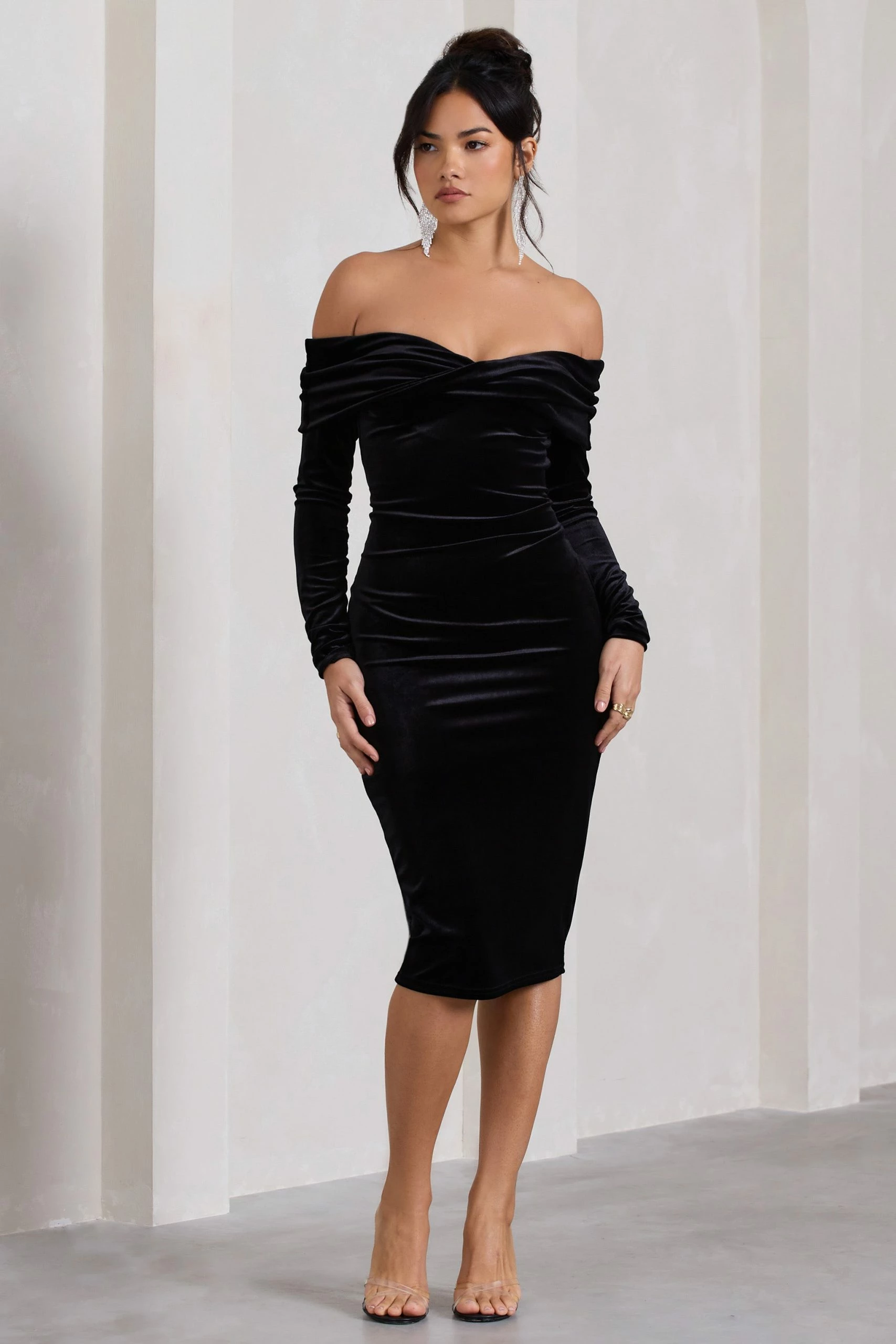 Get ready to receive many compliments during your next event in our aptly named black midi. Arriving in a luxurious velvet fabric, Compliment features a twisted bardot neckline, long sleeves and flattering ruching to highlight your best features. Paired with a tousled bun and statement earrings, this timeless bodycon would make the perfect pick for your next romantic dinner date.Â
