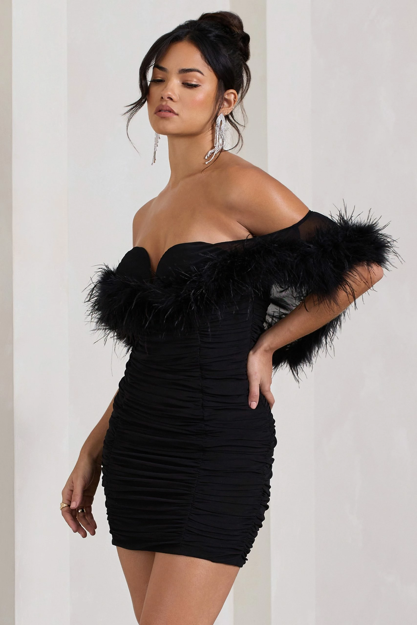 Get party-ready for your next event in our aptly named black mini Confetti. Detailed by its eye-catching mesh overlay and feather trim, this statement dress is a perfect option for your next birthday or girls night out. Try styling this fully ruched piece with statement earrings to further enhance your look.Â