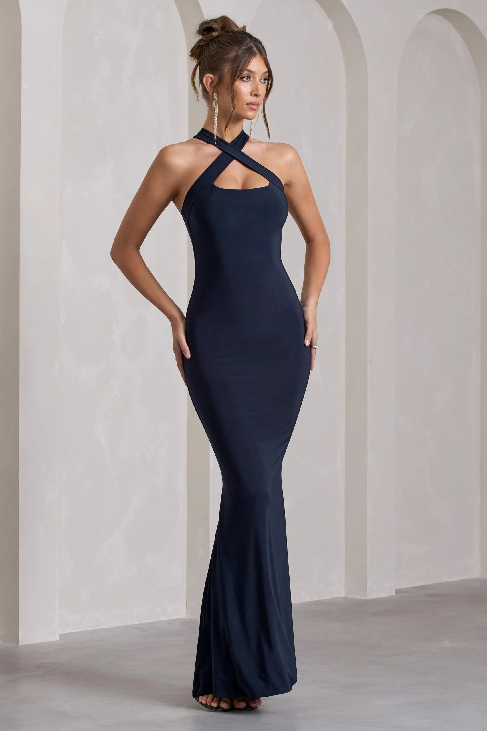 Carefully cut in a premium stretch jersey that clings to each curve, this navy maxi dress is as flattering as it is flawless. Detailed by delicately criss-crossing straps,Β Cross My HeartΒ is the epitome of understated glamour. For the perfect wedding guest look, try complimenting this halter-neck dress with a sleek bun and gold accents.