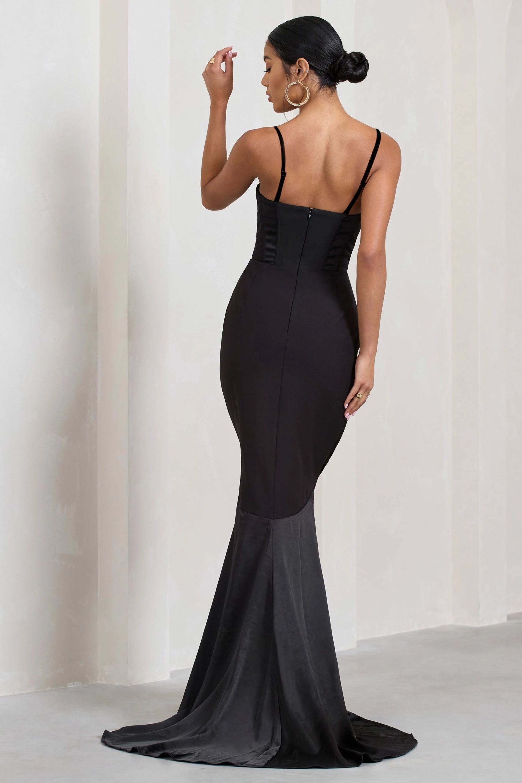 Our latest maxi dress Custom is perfect for any upcoming black tie event. Crafted in a classic black shade, this piece features a sweetheart corset bodice and removable straps that flows effortlessly into an elegant fishtail skirt.Â