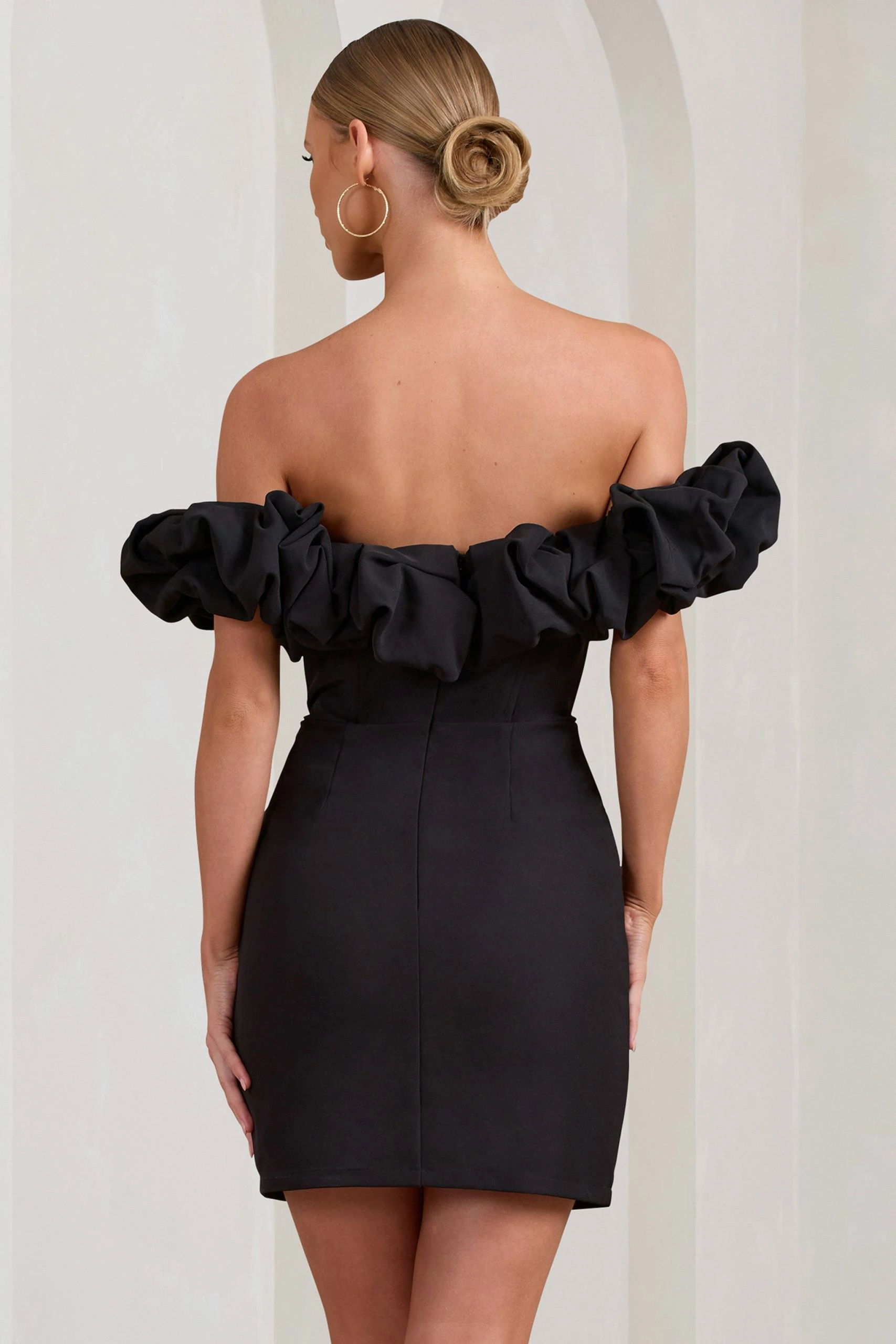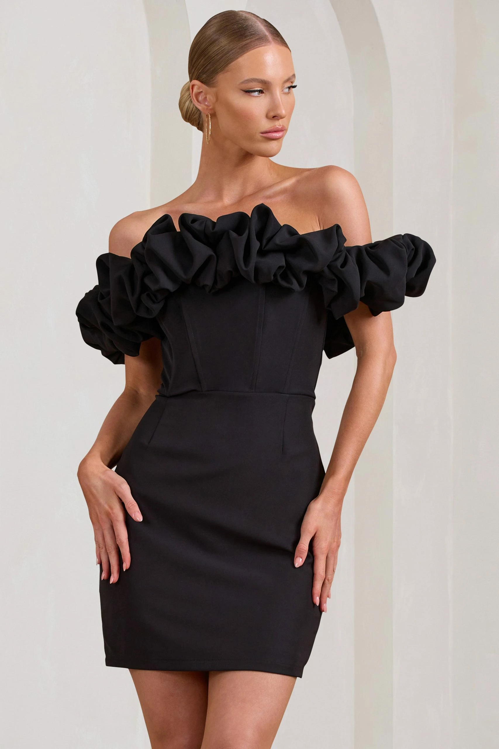 Dance till dawn in this perfectly-named mini dress designed in the finest black crepe fabric. Bardot in silhouette with a voluminous ruffle trim, this short-sleeved LBD is not only sweet but made to sculpt with its bodice boning and bodycon fit.