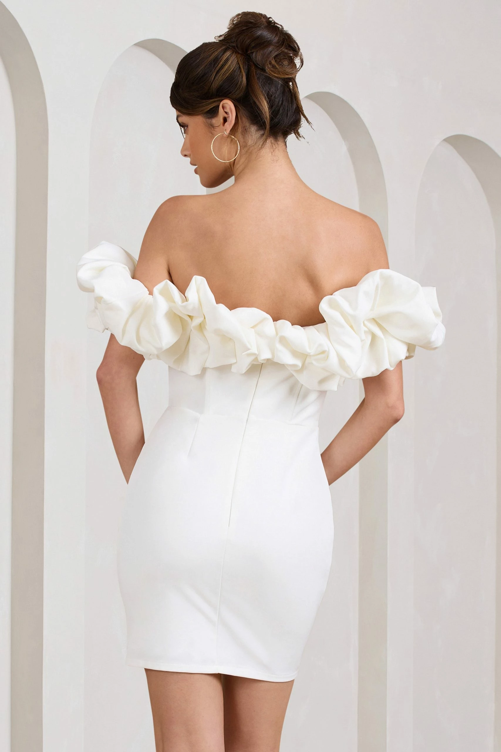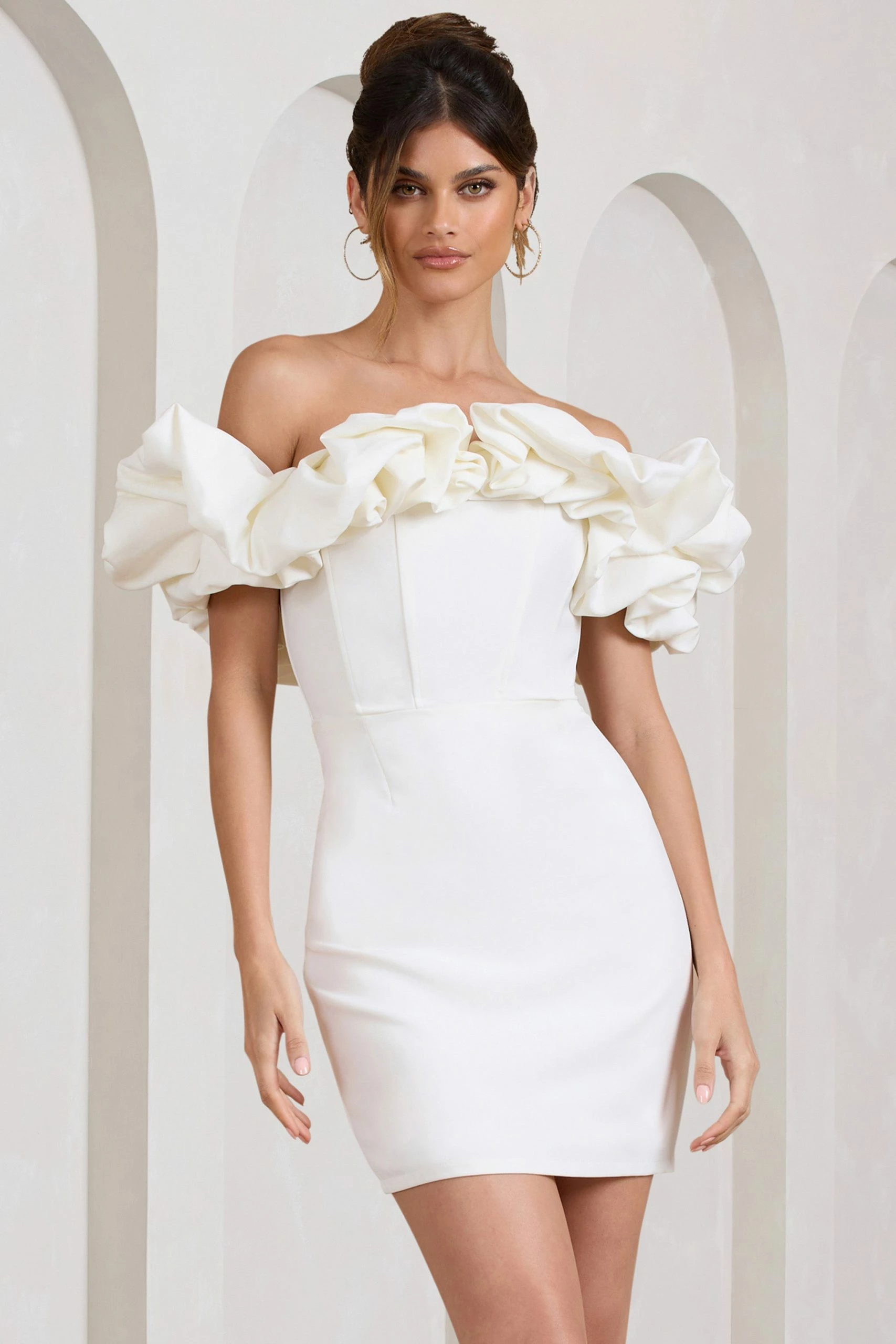 Dance till dawn in this perfectly-named mini dress designed in the finest white crepe fabric. Bardot in silhouette with a voluminous ruffle trim, this short-sleeved mini dress is not only sweet but made to sculpt with its bodice boning and bodycon fit. Why not style Dawn with our Lace Language gloves for a sophisticated look.