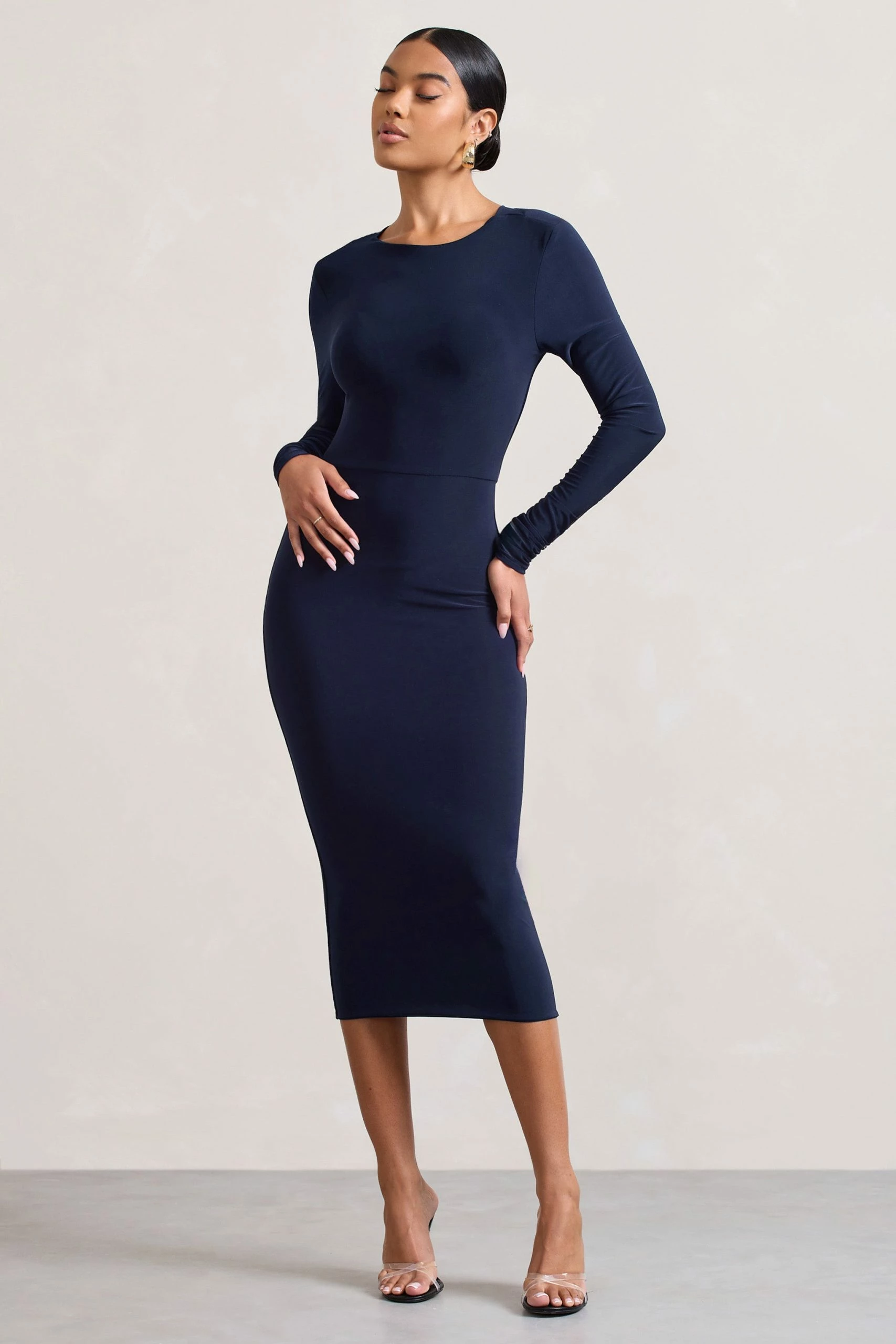 Keep things classy in our long-sleeved midi dress Dynasty Darling. Arriving in a deep navy hue, this bodycon was crafted in our signature stretch jersey to ensure the perfect blend of comfort and confidence. Style Dynasty Darling with a sleek bun for the ultimate wedding guest look.