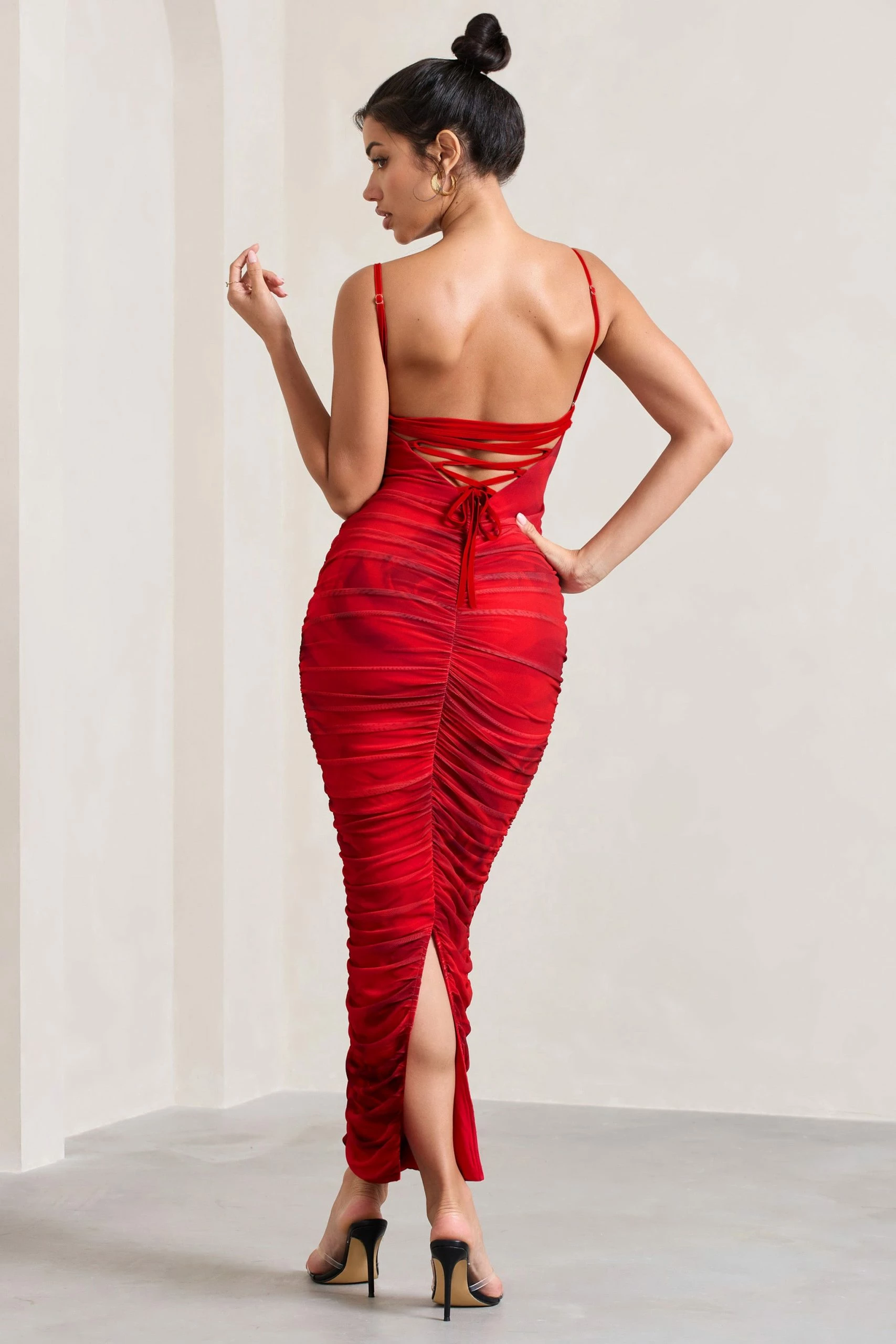 Ellis is a classic, mesh-layered maxi to see you through every social occasion this season. Framing your figure in a fully-ruched stretch fabric, this rose-printed bodycon dress is characterised by a straight neckline, delicate straps and a lace-up back. Style Ellis with understated accents to keep all eyes on your cinched silhouette.