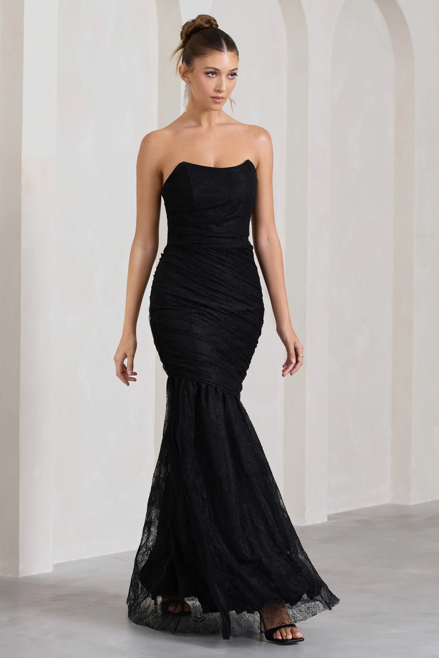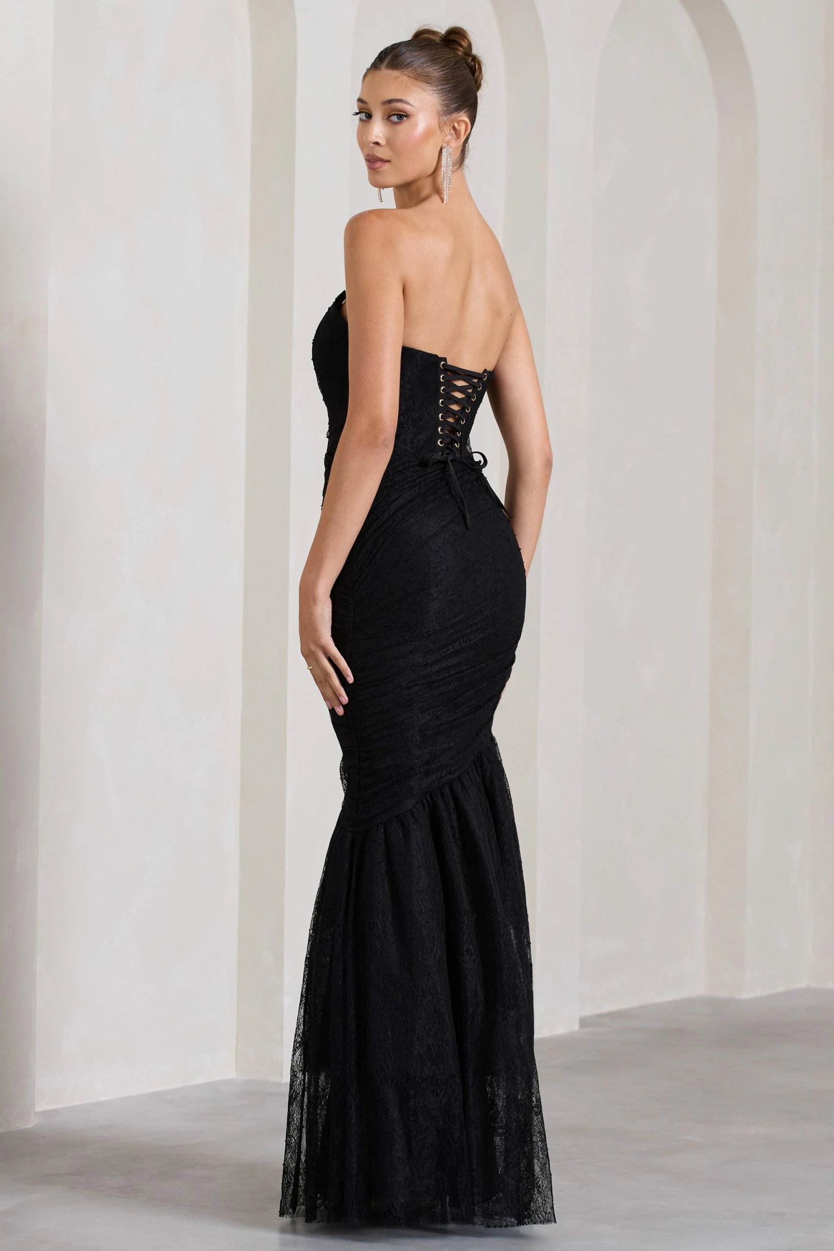 Capture everyones attention at your next formal event in our aptly-named black maxi dress Encapsulate. This strapless piece has been wrapped in a premium black lace fabric highlighted by gathered ruching to enhance your natural curves. A sculpting boned corset bodice and lace-up back further elevate this elegant maxi dress, before finishing with a floor-sweeping fishtail skirt.Â