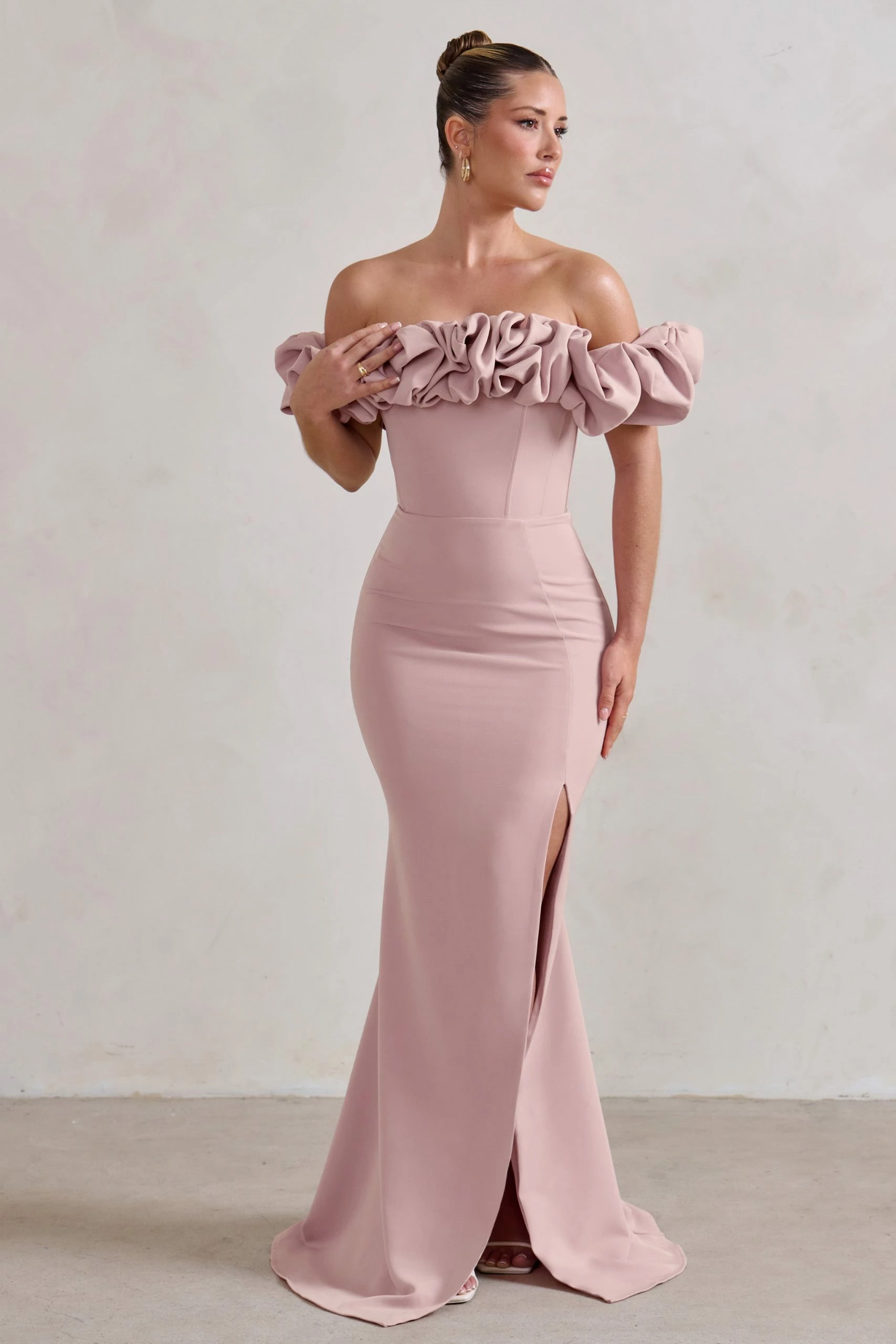 A fine trim of voluminous ruffles makes this short-sleeved maxi dress truly unforgettable. Perfect for bridesmaids or an upcoming birthday, our Esmeralda boasts a Bardot silhouette made from blush pink crepe with darts to define your waistline. More darts shape a floor-sweeping skirt which also features a striking side split.