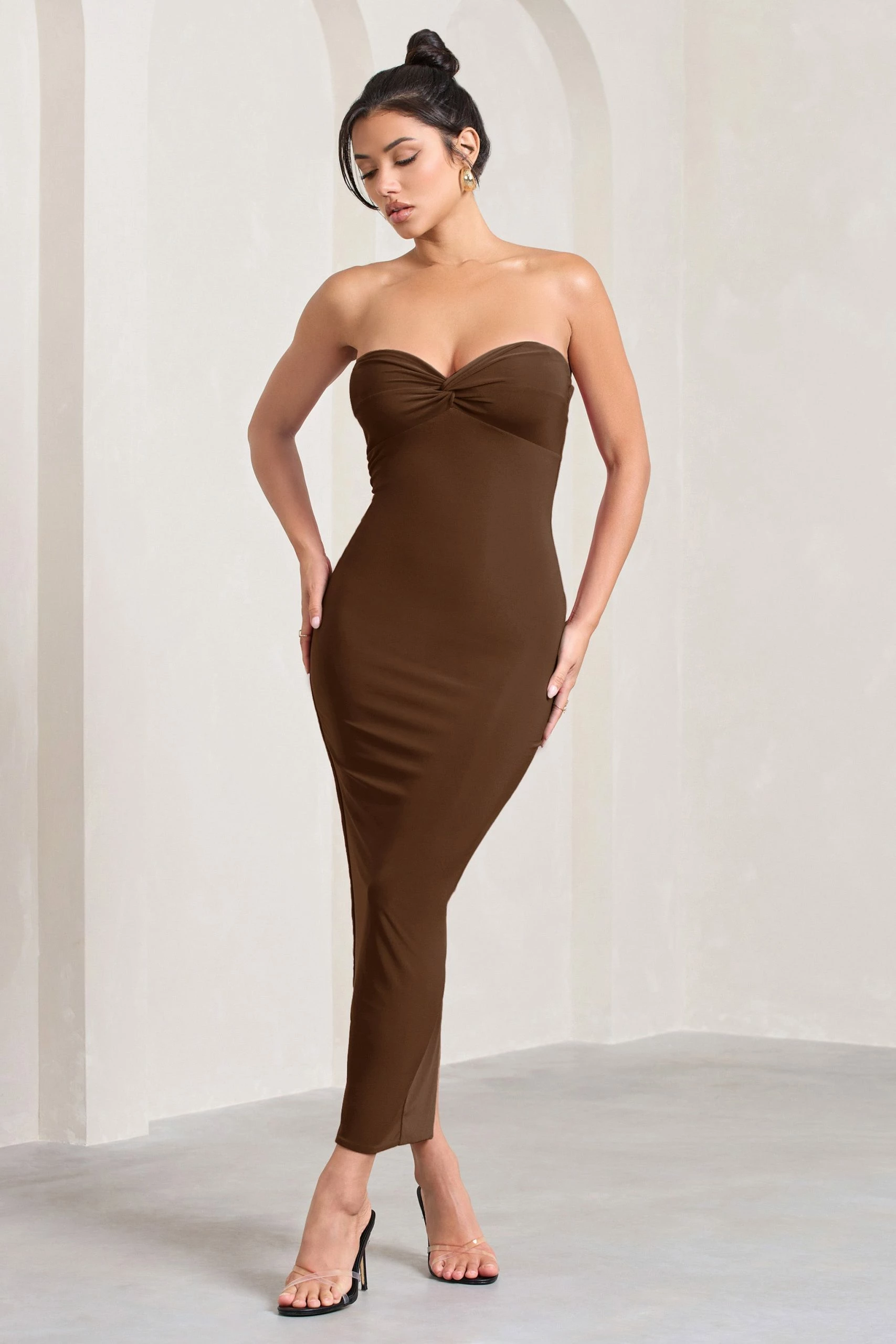 Crafted in our signature stretch jersey, this strapless dress was designed to outline your natural feminine curves. Arriving in a rich shade of chocolate, Evita is features a sweetheart neckline flourished with a twisted knot detail. Try pairing this maxi dress with strappy stilettos for the ultimate graduation or dinner party outfit. Â