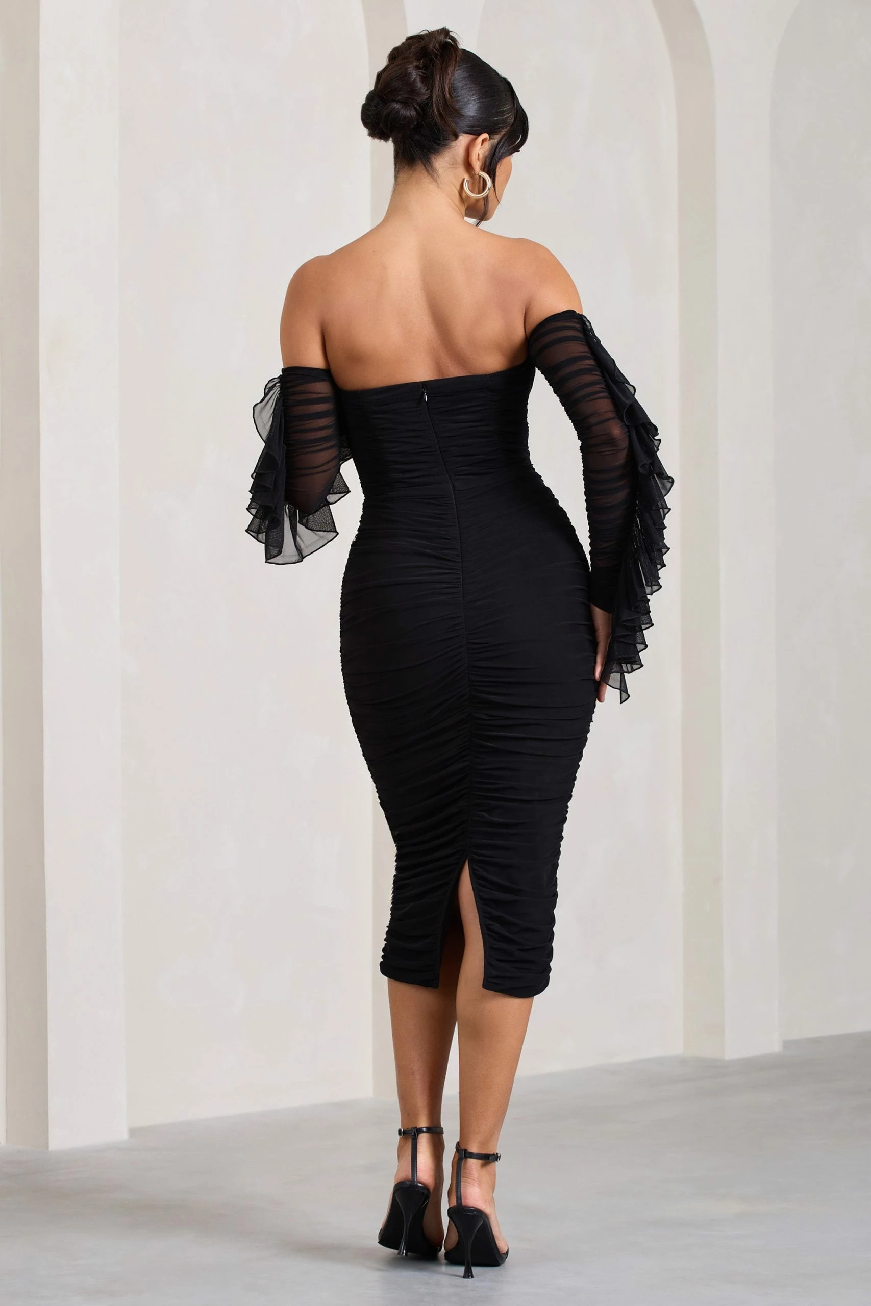 Be the first to review “Favor | Black Ruched Mesh Bardot Midi Dress” Cancel reply