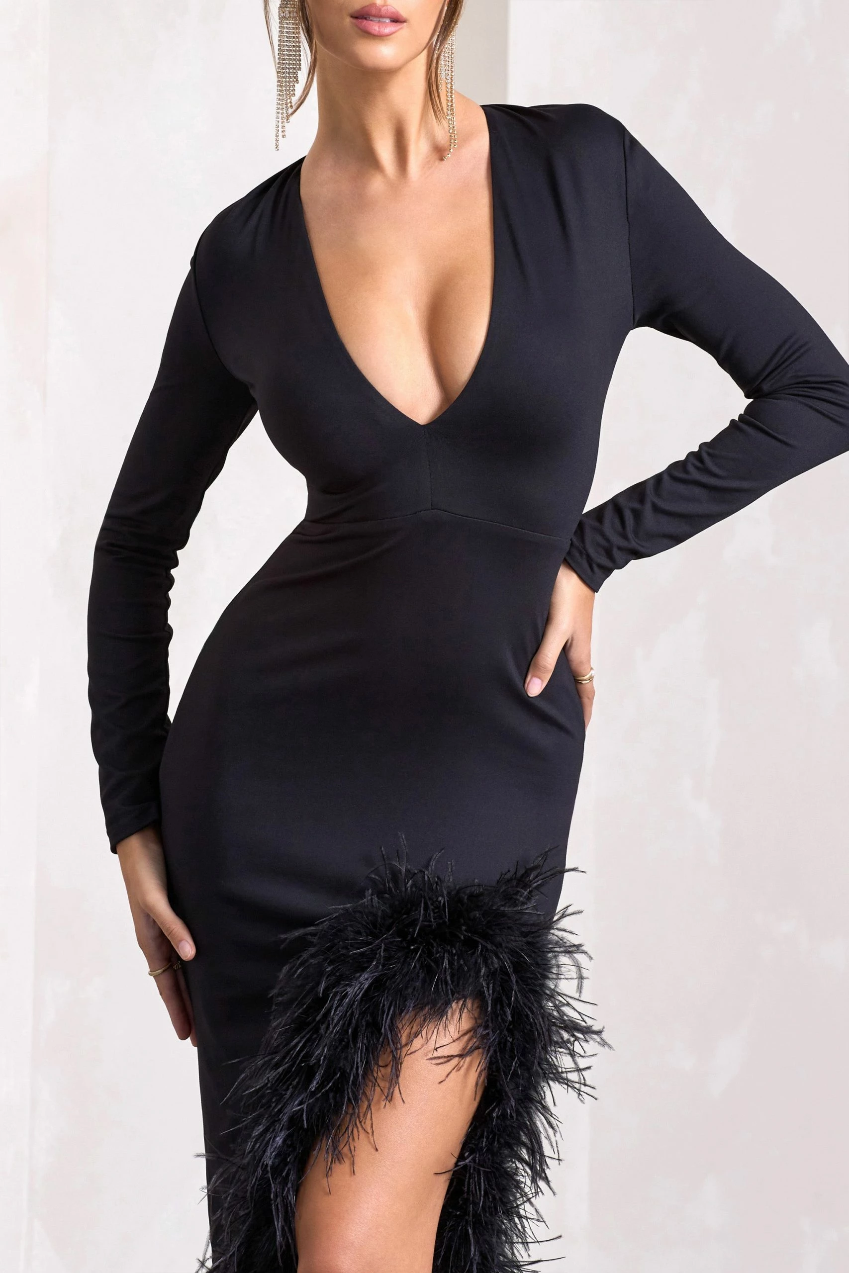 Slip into something seductive wherever you’re headed whether it’s a black–tie event, gala dinner or prom. Our elegant black “Finale” maxi dress oozes drama with a daring split adorned with ostrich feathers that draw attention to elongated legs.