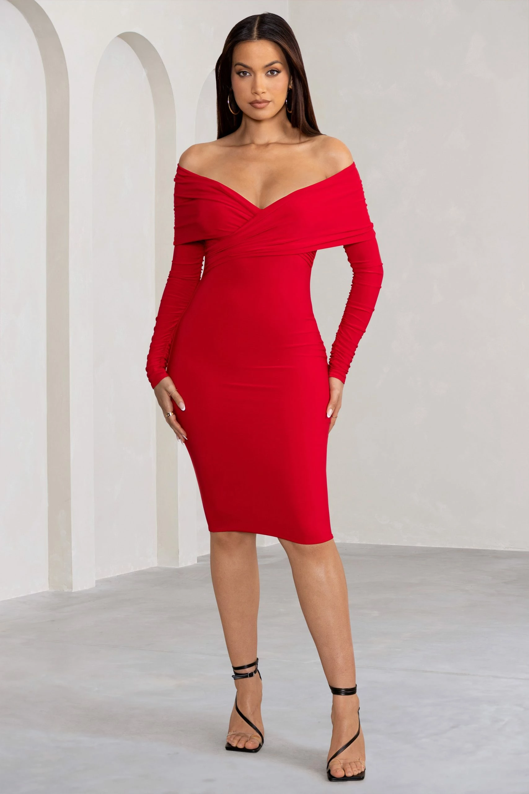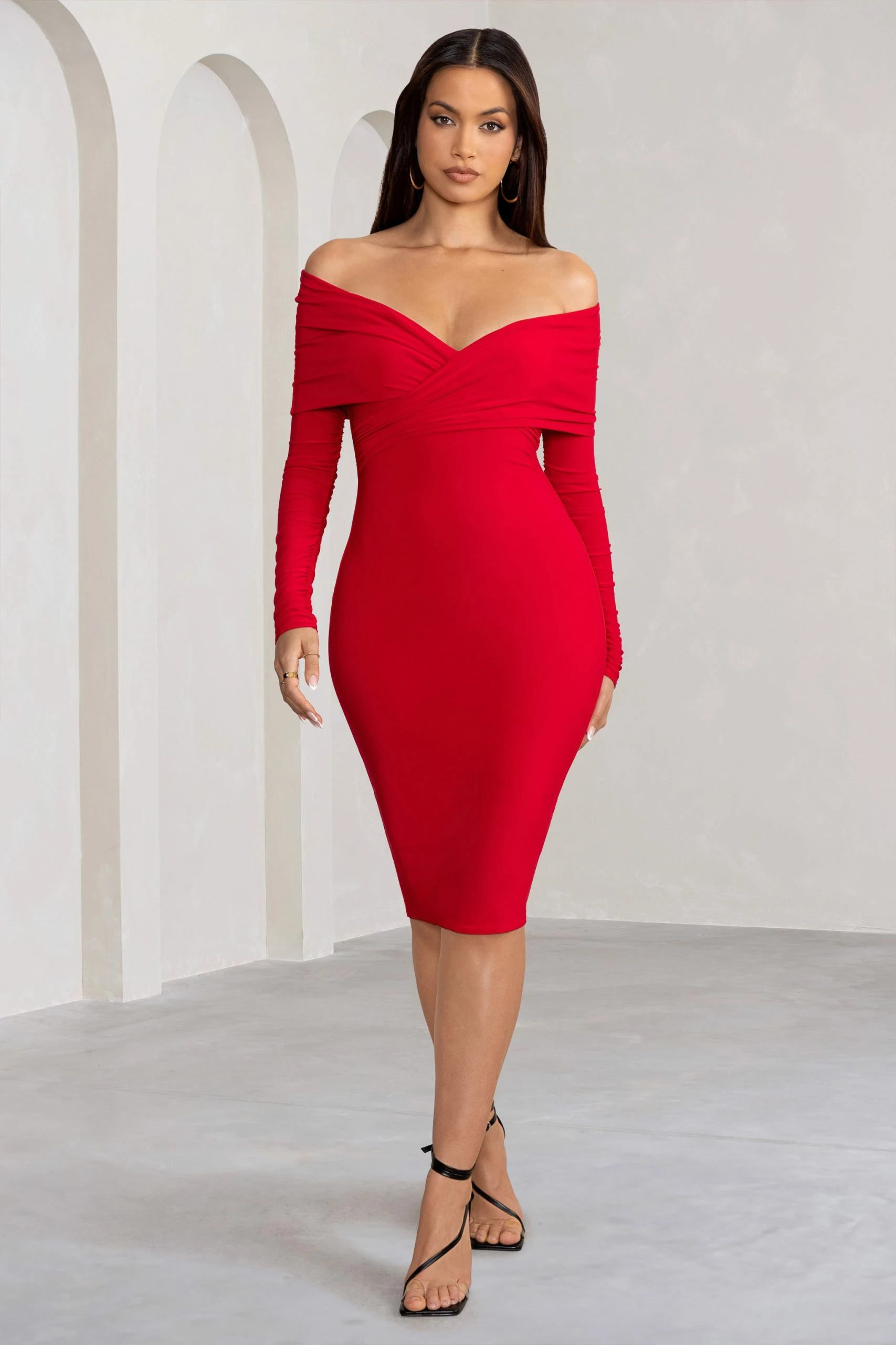 Channel Hollywood glamour with this stunning, form-flattering evening dress. Our elegant “Flatter Me” midi dress is cut in a curve-contouring stretch jersey fabric that hugs your figure and cinches your silhouette. This glam gown features a mid-length hem, feminine wrap detail, and an off-shoulder Bardot neckline. If you’re looking for a real showstopper this dress is the one for you.