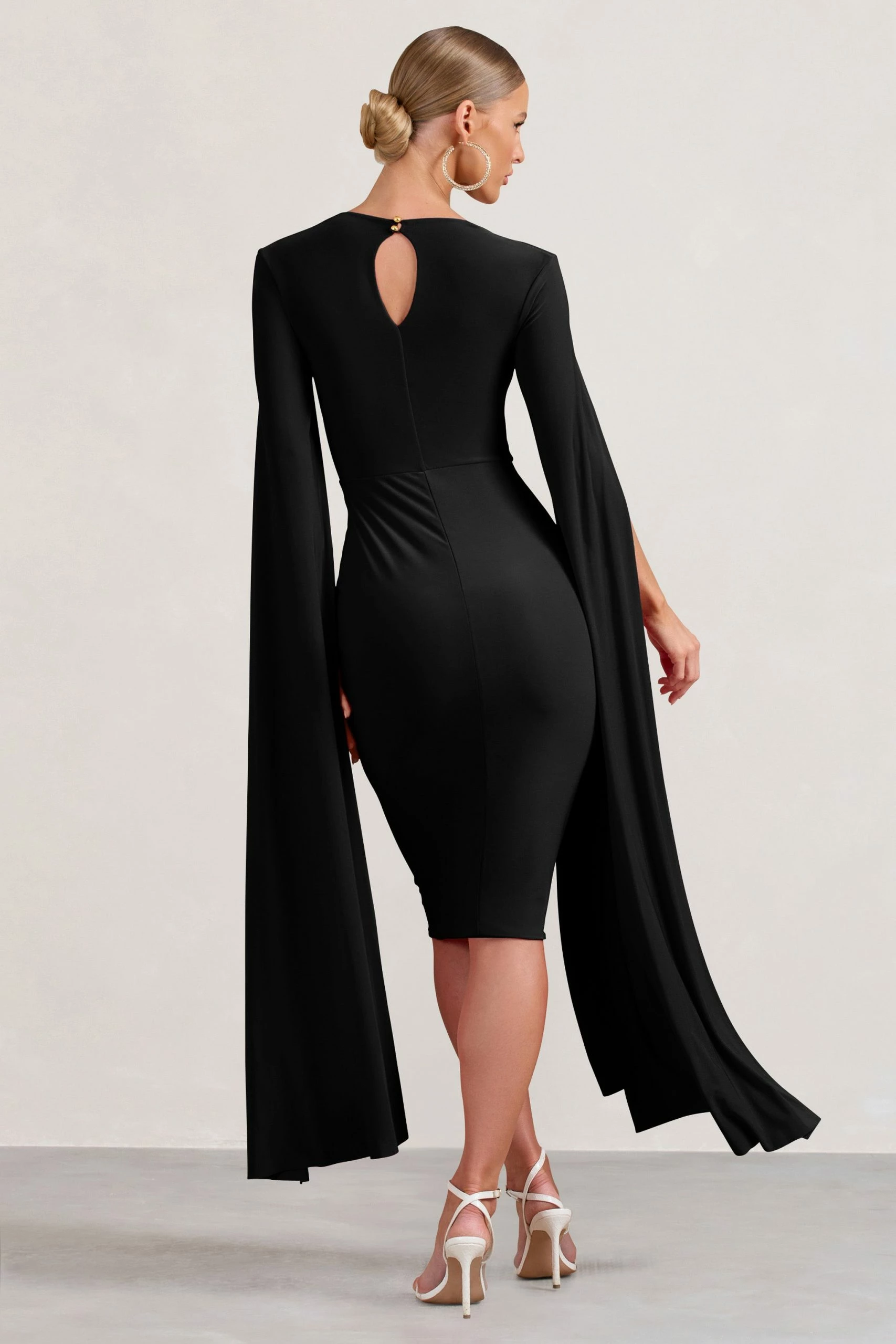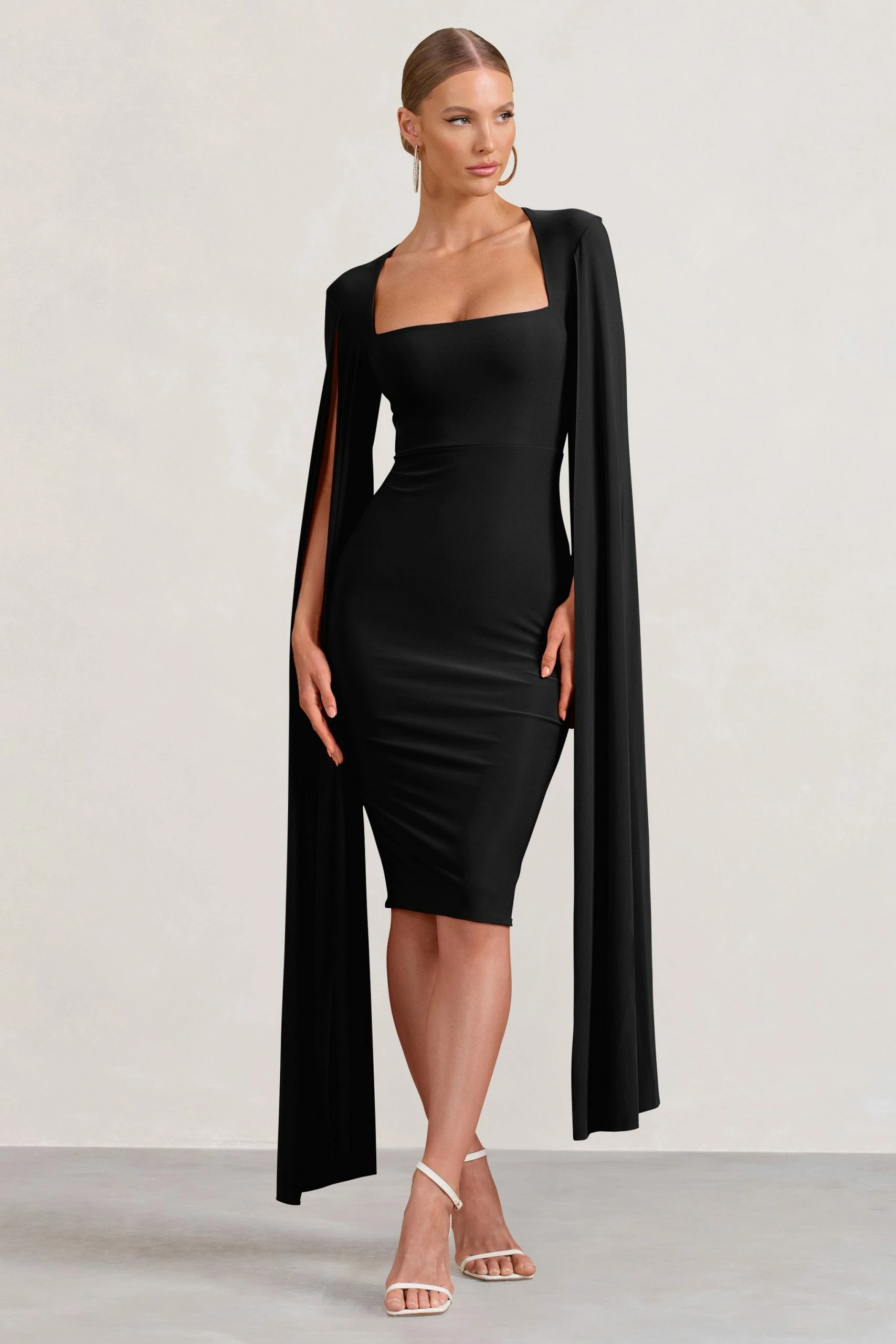 As flawless in fit as the name implies, this black bodycon dress arrives in our signature stretch jersey with a square neckline and sweeping cape sleeves. Flawless is the ultimate midi dress for any special occasion this season, from birthday brunches to grand ballroom weddings.