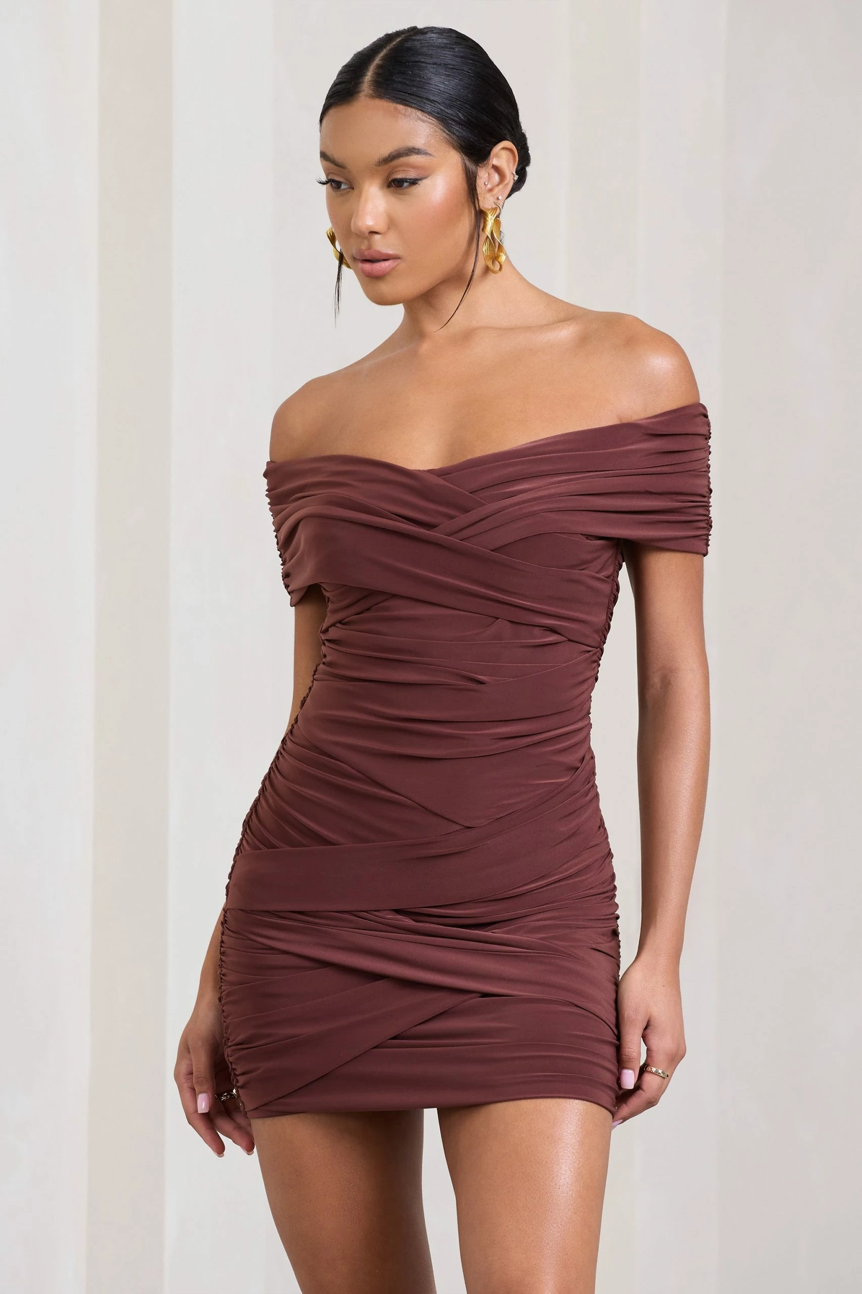Perfect for those last minute nights out, High Ground is the mini that every evening wardrobe deserves. Carefully wrapped in layers of our soft signature stretch jersey, this brown staple contours your curves in all the right places. Try styling this bardot mini dress with a sleek bun to give its neckline the attention it deserves.Â
