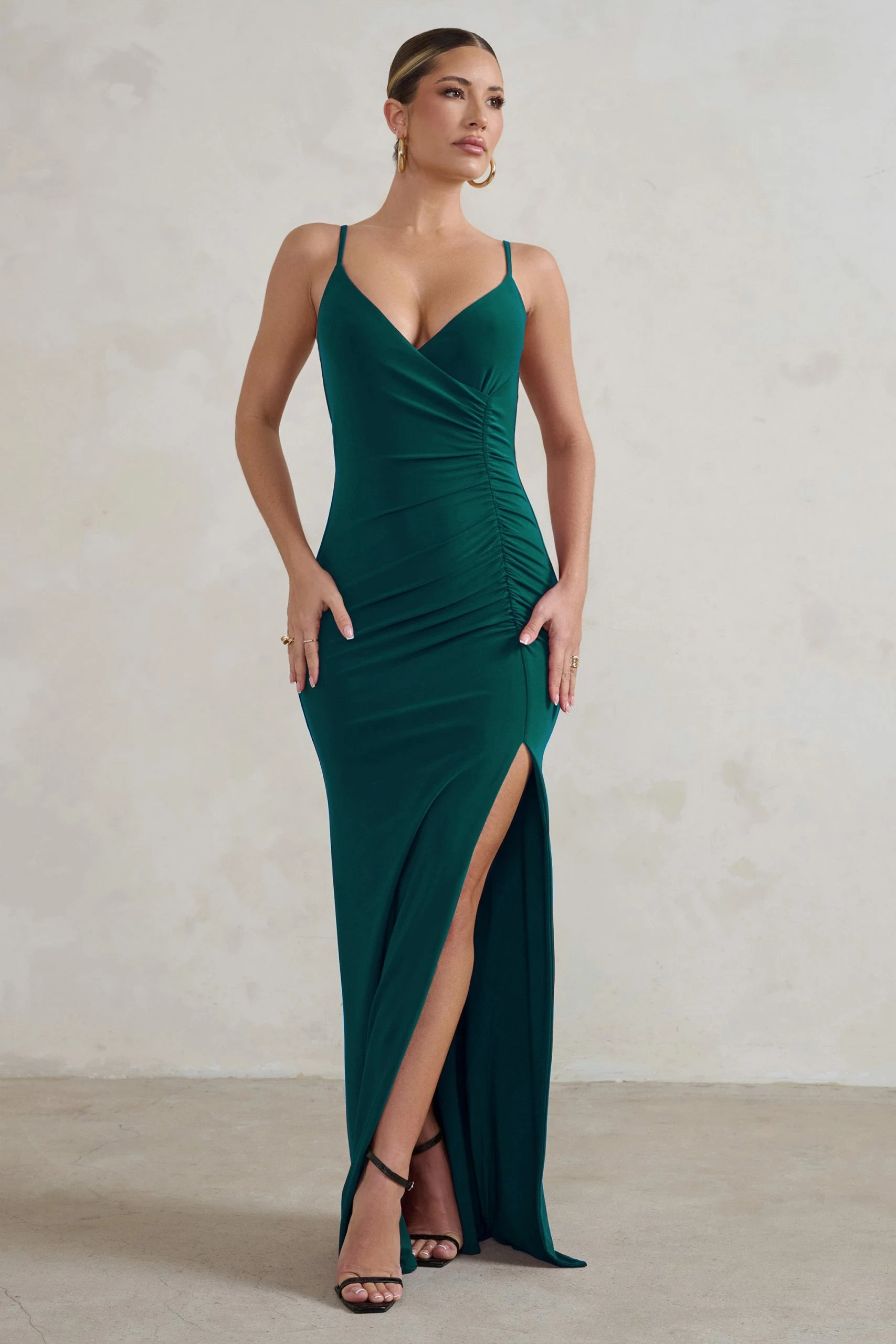 Wrap silhouettes truly never go out of style and our latest design, Jeanne, is the perfect option to please every bridesmaid. The ruched maxi dress arrives in our premium bottle green jersey with a plunging v neckline, slim straps and a daring split to showcase the leg. Pair Jeanne with diamante hoops for a touch of sparkle to entice the eyes of every wedding guest.