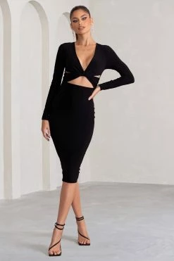 Super stylish and flattering, our Julieta midi dress has been designed to stand out. Beautifully crafted with our premium jersey fabric in classic black, this curve-contouring midi will highlight your endless curves with its full-body ruching. The plunge neckline features twist detailing and a cut-out design which is perfectly balanced by the long sleeves and midi length of the dress. Julieta is daring yet chic, perfect for an alluring sophisticated look. Make an entrance at your next event in this midi dress.