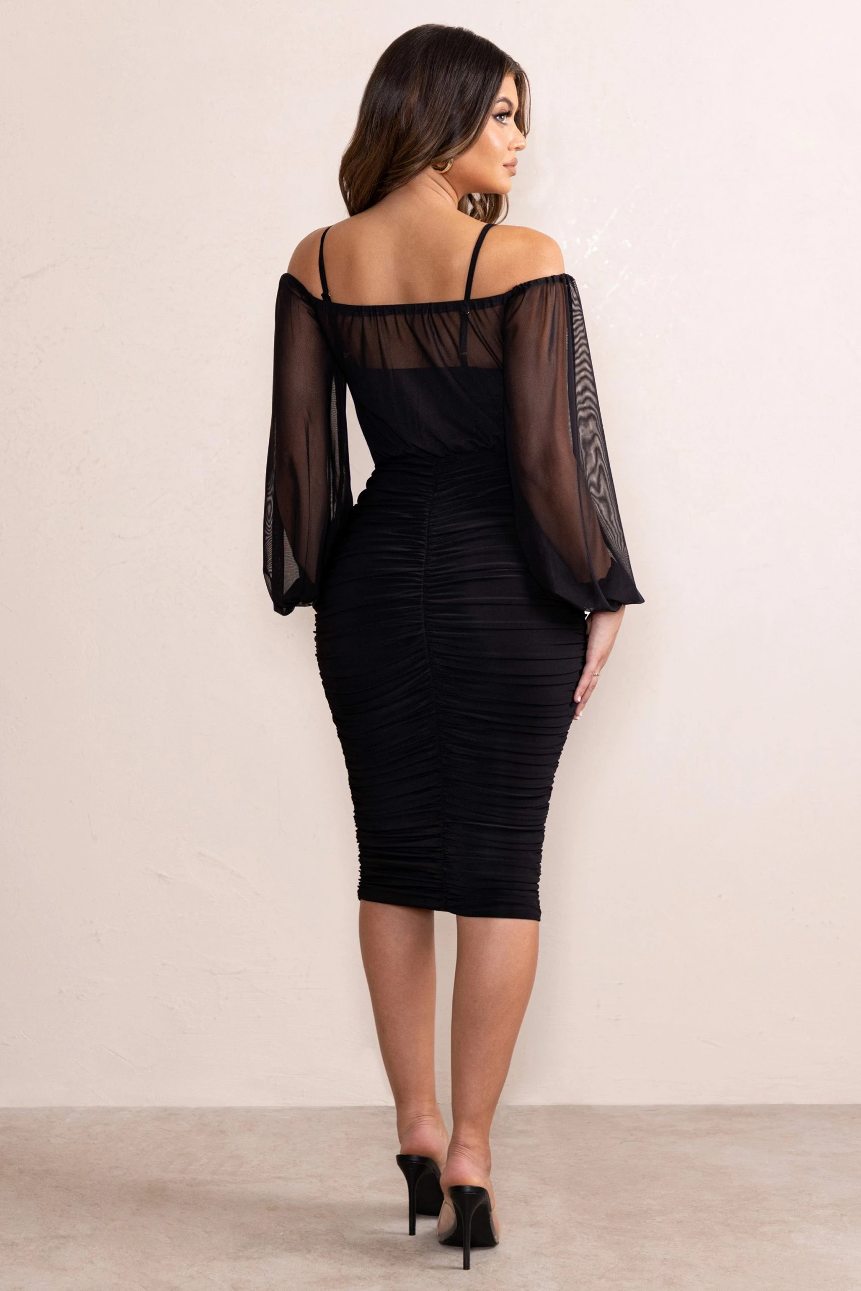 Revamp your occasion wardrobe with our beautiful Keisha midi dress. Carefully designed with our premium jersey fabric with delicate mesh overlay, the sophisticated balloon sleeves will elevate your look and the elegant bardot neckline is super feminine. The full-body ruching is super flattering, perfect for showing off your hourglass figure at your next black-tie event or VIP party. Take your look from 0 to 100 with this gorgeous style!