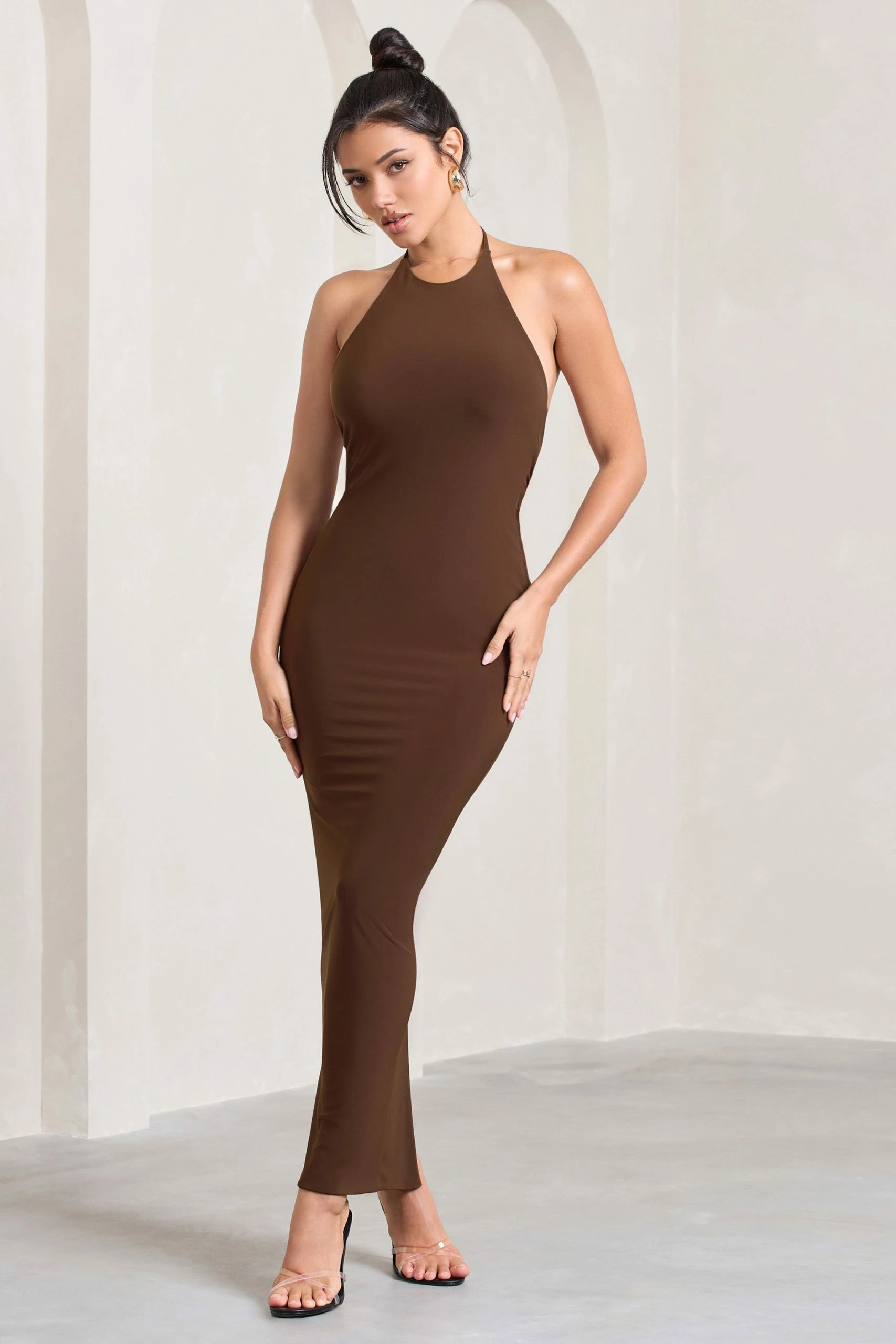 Every wardrobe needs a contemporary staple like Kirsten. This backless brown maxi dress was crafted in a premium stretch jersey to contour your curves while also ensuring a maximum level of comfort. Try pairing Kirsten with a sleek bun to show off its flattering halter-neck feature.