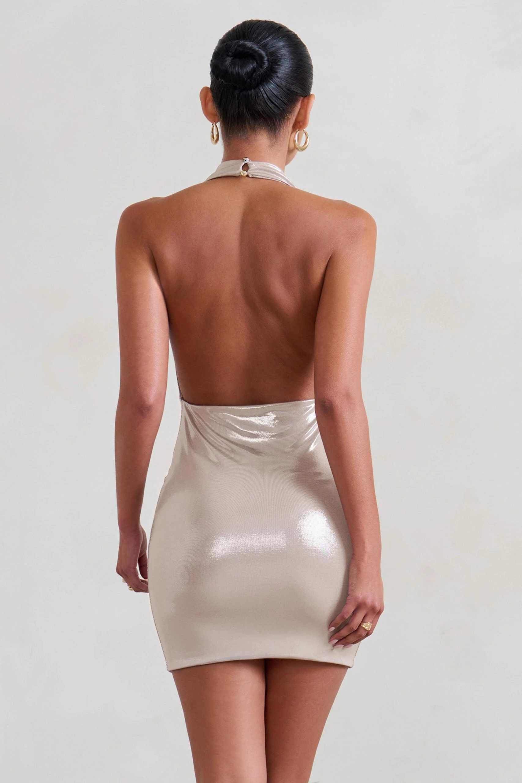 What party wardrobe would be complete without a metallic mini like our darling Liliana? Arriving in Club L’s signature stretch jersey, this gold mini dress boasts a high halter neckline with draped cowl detailing and an open back. Finish the shimmery dress with strappy stilettos strong enough to last on the dance floor till dawn.