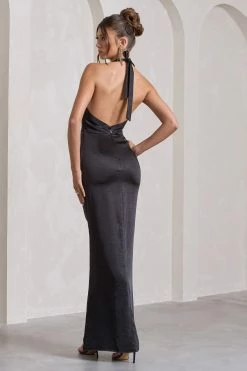 Rebecca | Black Satin Plunge Halter-Neck Open-Back Split Maxi Dress