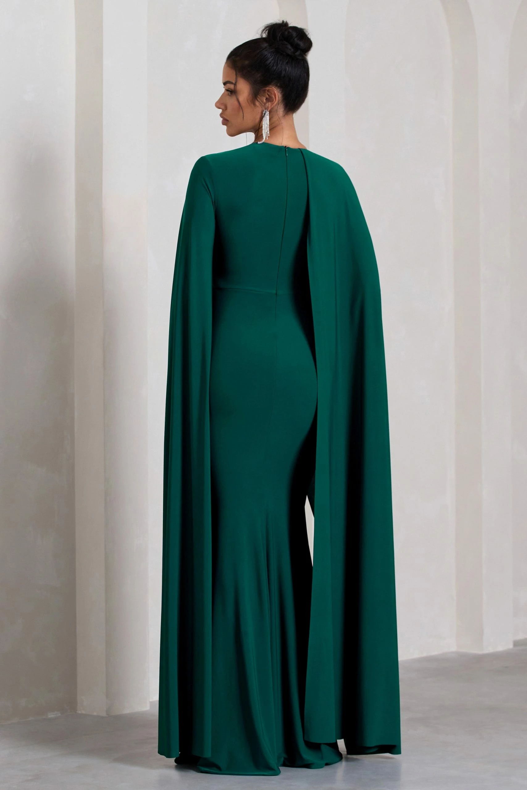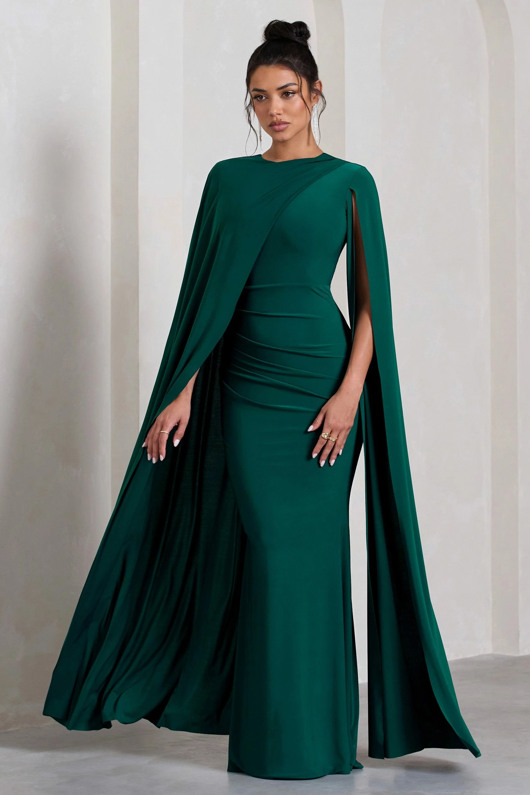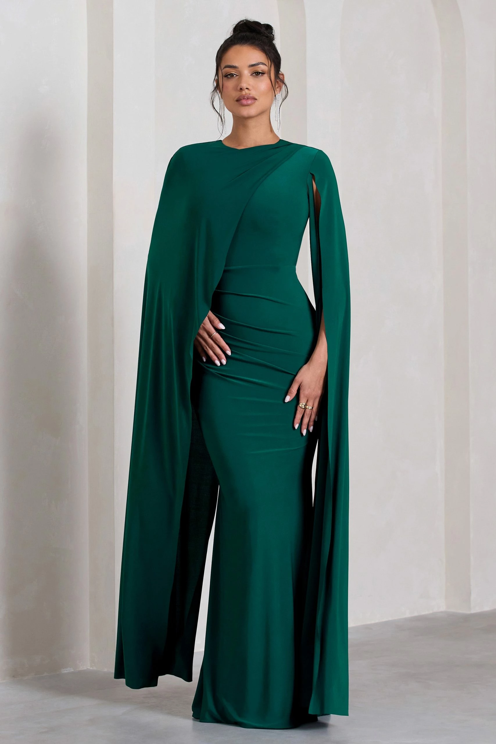 Defined by an extravagant asymmetric cape, Magdelena is a sophisticated option for your next black tie wedding or race day event. Crafted in our signature stretch jersey, this green maxi dress features a high neckline and gathered waist before falling into an elegant floor sweeping skirt.Â