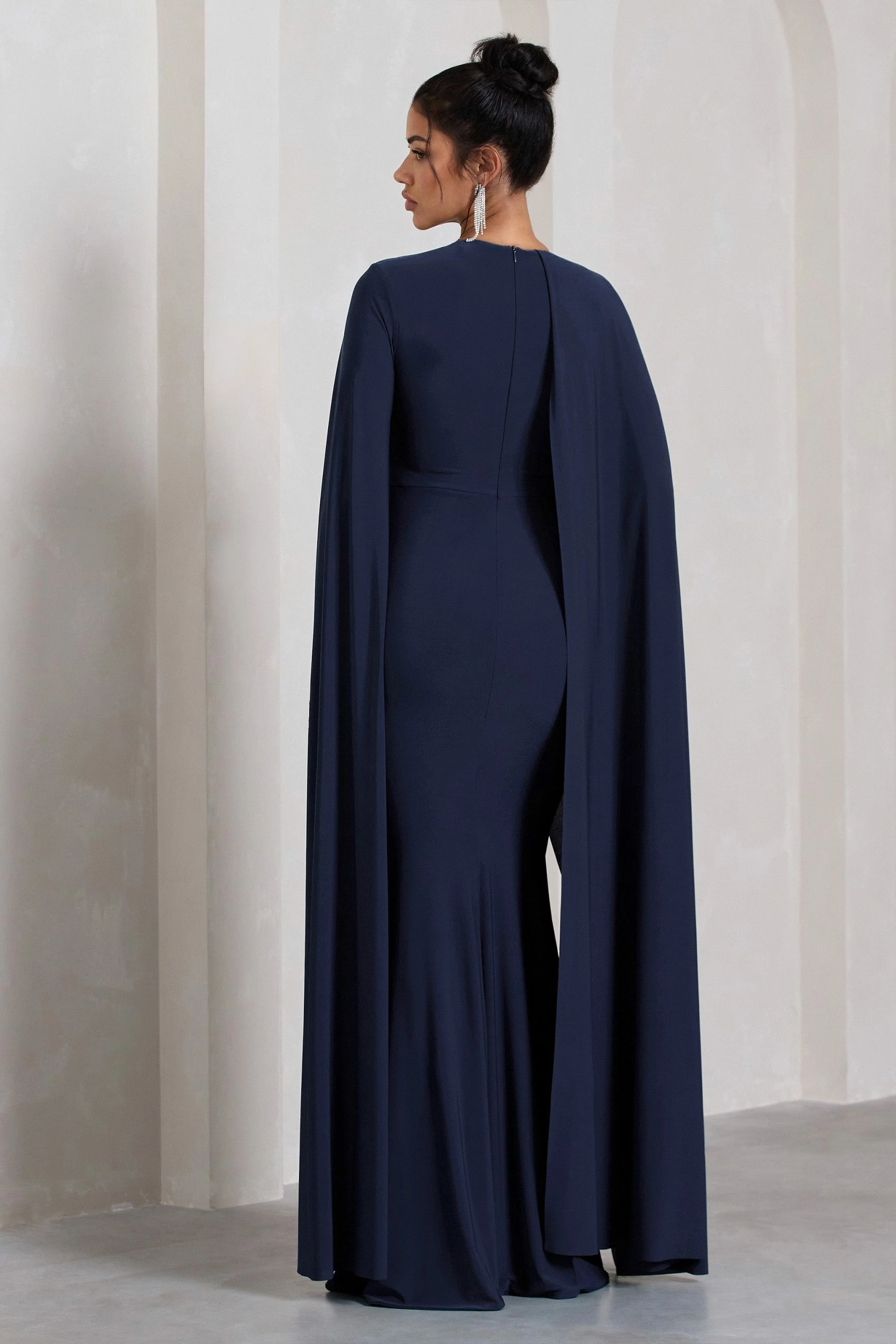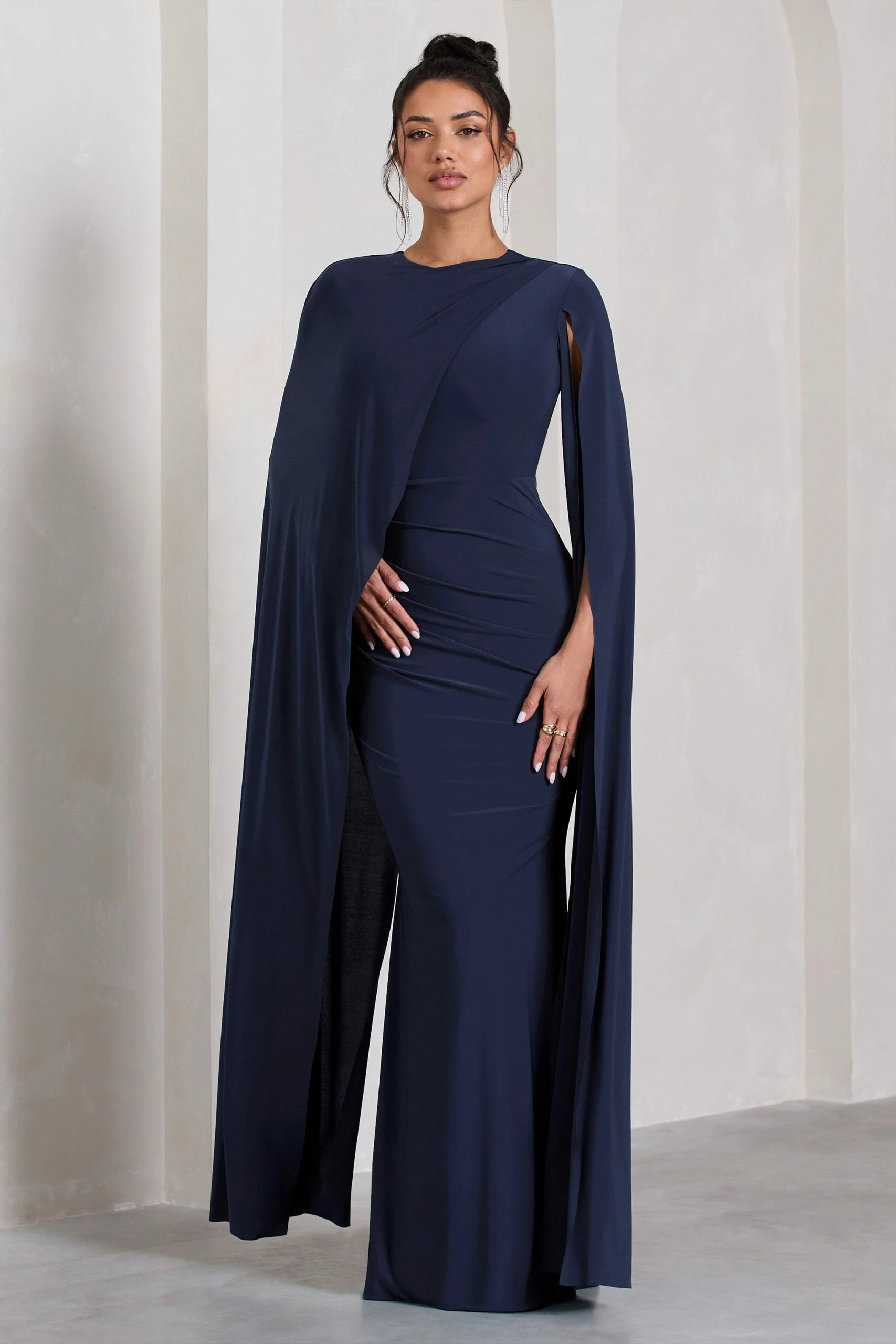 Defined by an extravagant asymmetric cape, Magdelena is a sophisticated option for your next black tie wedding or race day event. Crafted in our signature stretch jersey, this navy maxi dress features a high neckline and gathered waist before falling into an elegant floor sweeping skirt.Â