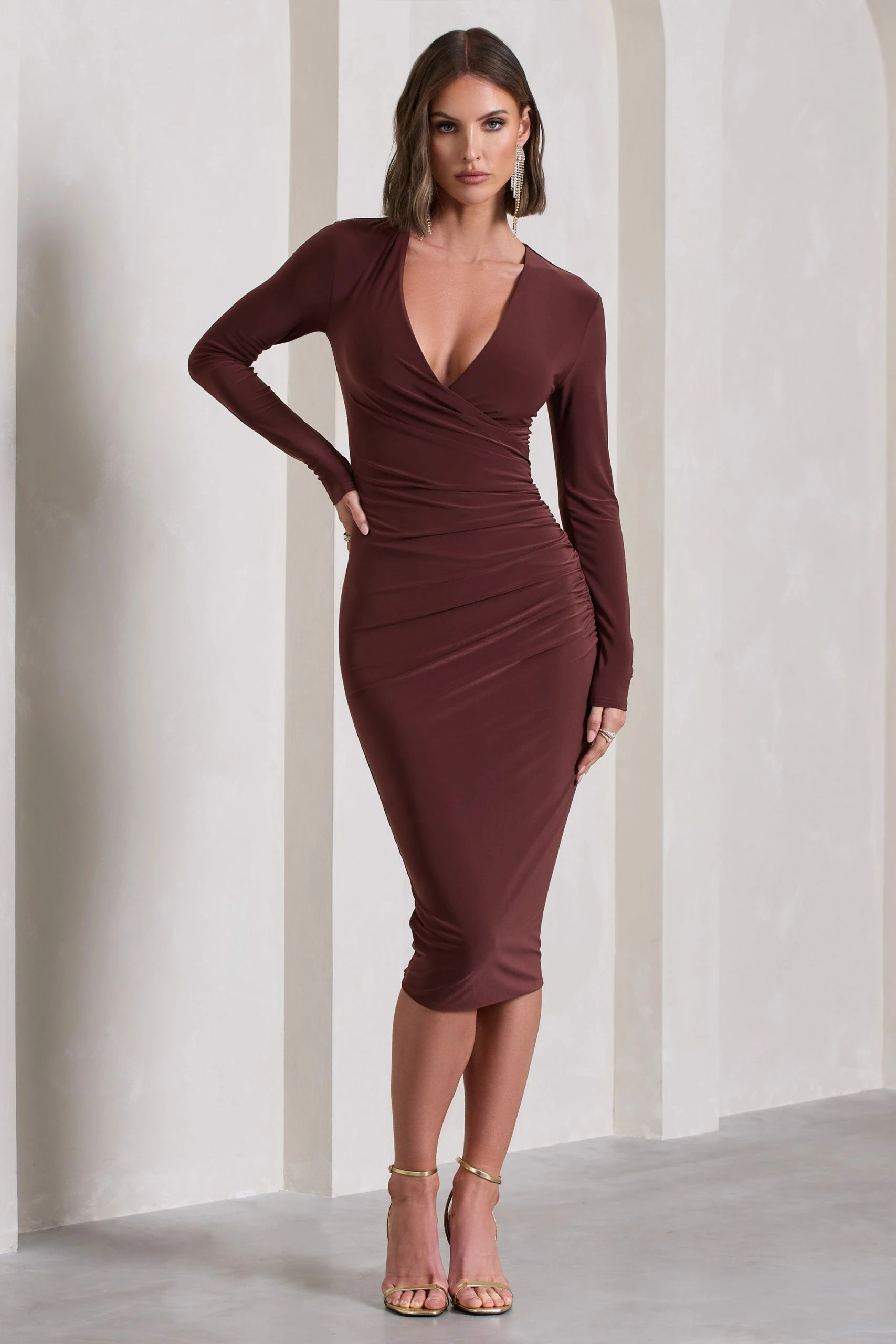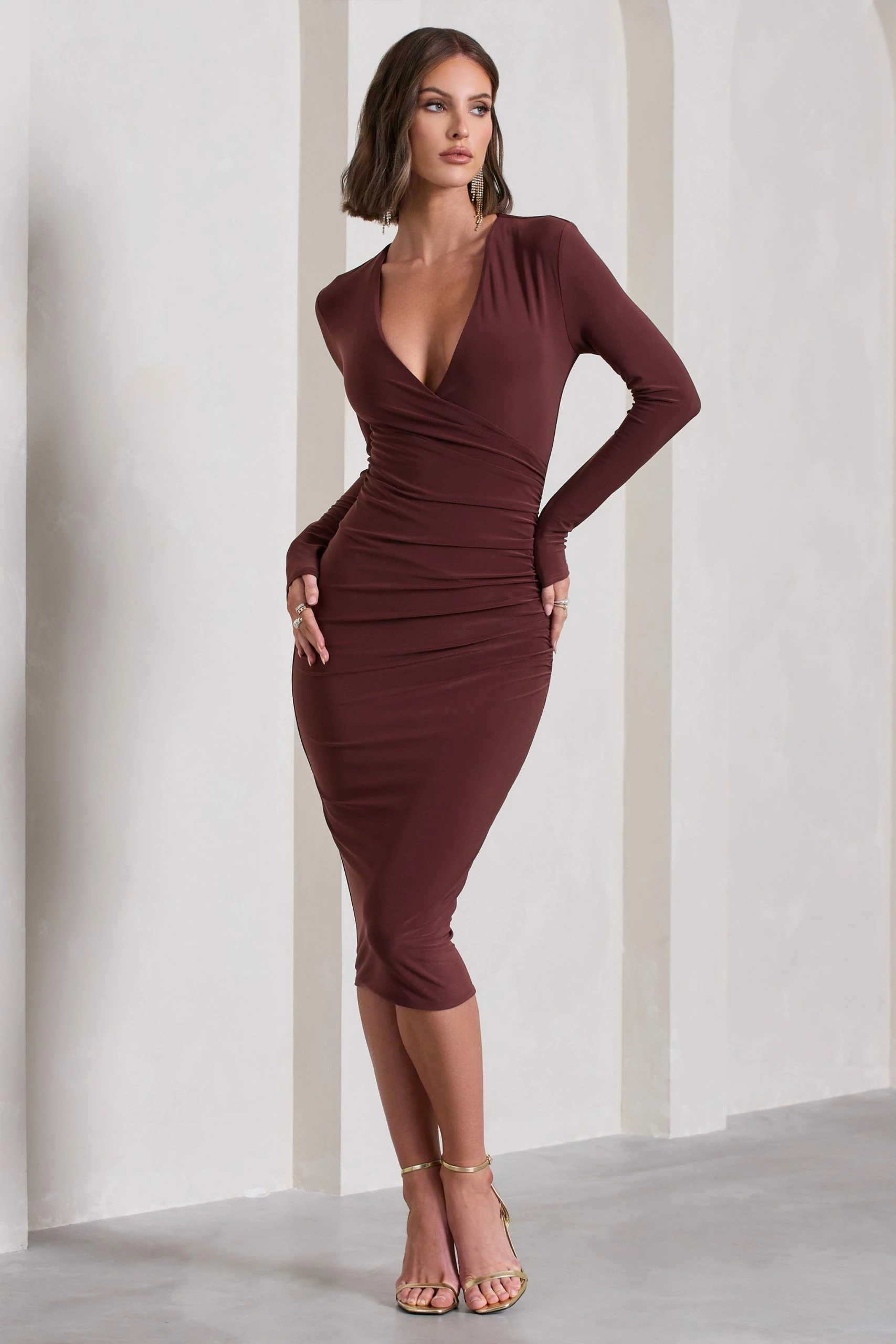 Every wardrobe needs a sculpting staple like Marcia. Crafted in a rich chocolate brown shade of our premium stretch jersey, this bodycon midi features a plunge neckline, gathered waist and long sleeves. For a sophisticated evening look, try styling Marcia with a sleek bun and gold accents.