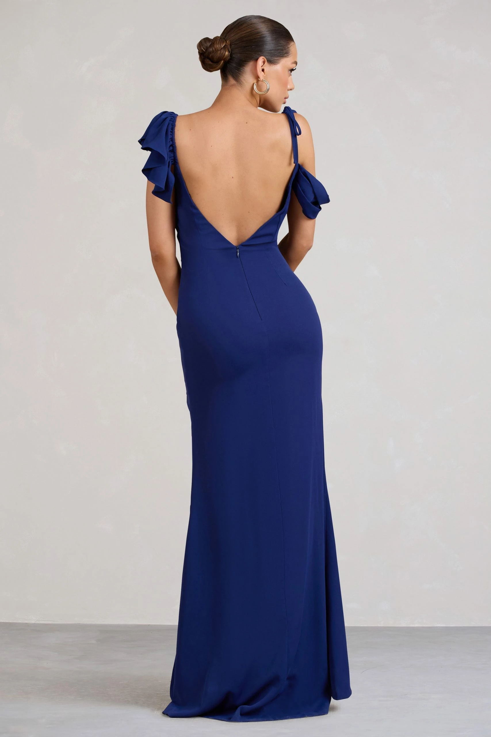 Whether you’re headed to the Italian coast or a small yet special celebration, Merlot is the asymmetric maxi dress to wear for effortless elegance this upcoming season. As enticing as the dark wine it’s named after, this long navy dress is designed in a lightweight woven fabric that drapes over your curves with ease. Merlot also features an off-shoulder sleeve, a laced strap and a feminine ruffled sleeve.