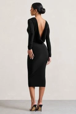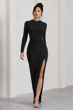 Arriving in a timeless, sophisticated silhouette, Miley is a formal staple to see you through every season. Crafted in our signature stretch jersey, this long-sleeve black maxi dress displays a twisted knot detail that continues into a daring high-leg split. For the perfect dinner date ensemble, try styling Miley with a sleek bun to show off its enviable open-back.
