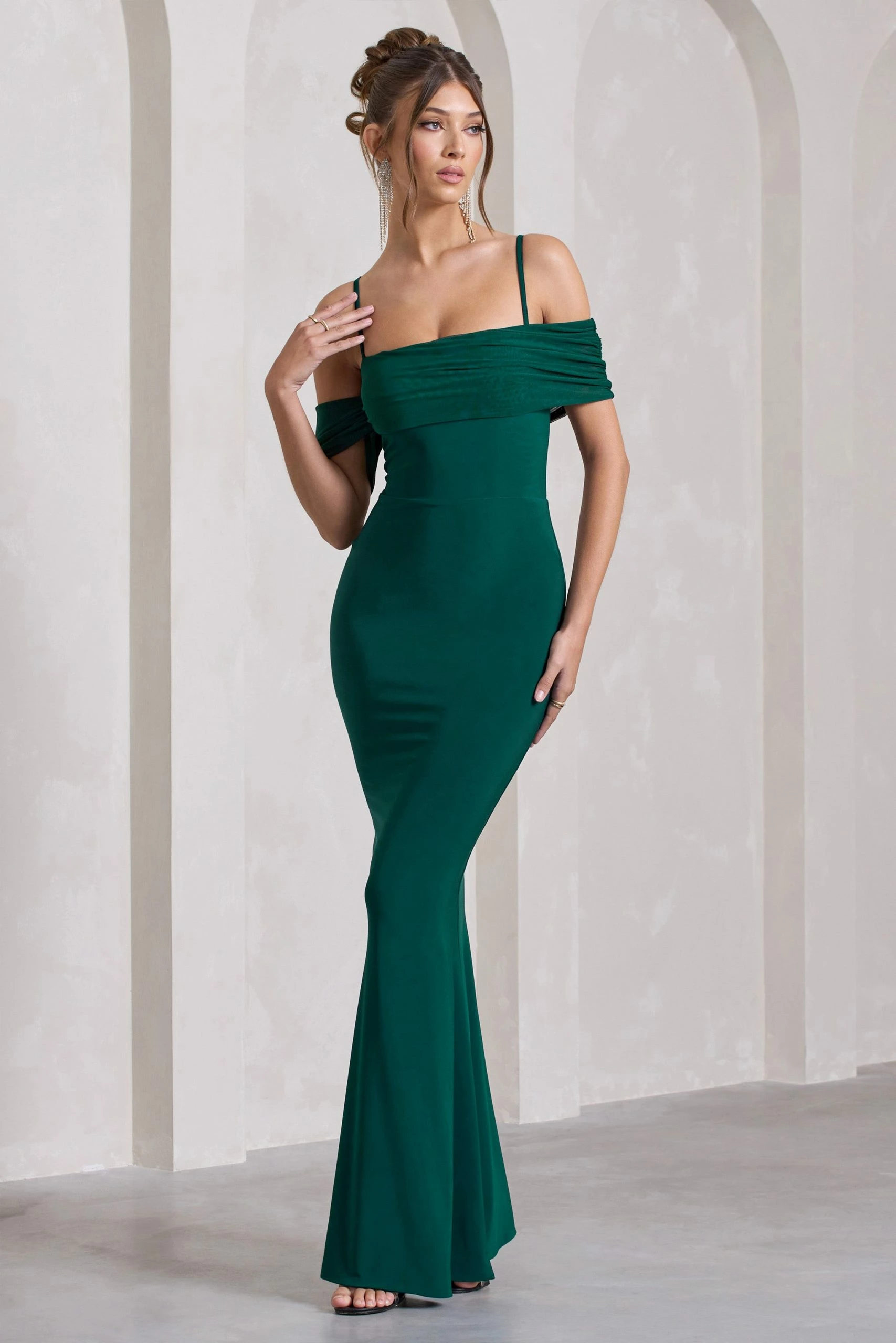 Simple yet graceful, our Miracle maxi dress was crafted to see you through any black tie occasion. Arriving in a bottle green shade of our signature stretch jersey, this form-flattering maxi dress is defined by a delicate mesh bardot neckline and thin adjustable cami straps. Try styling Miracle with a tousled bun and strappy heels for a timeless bridesmaid ensemble.