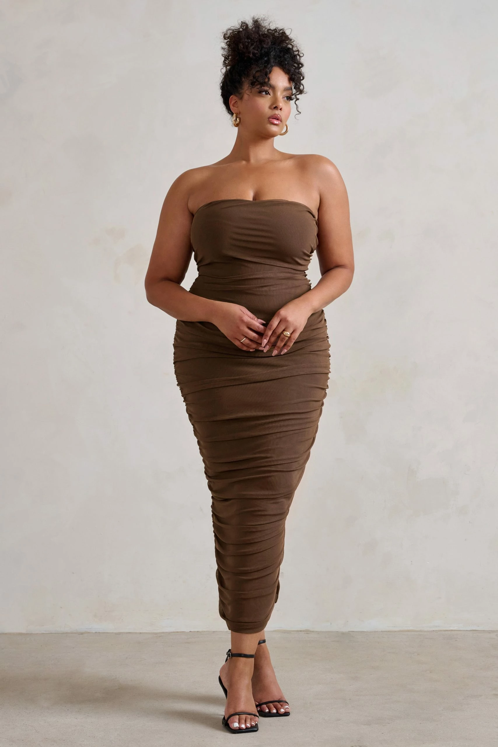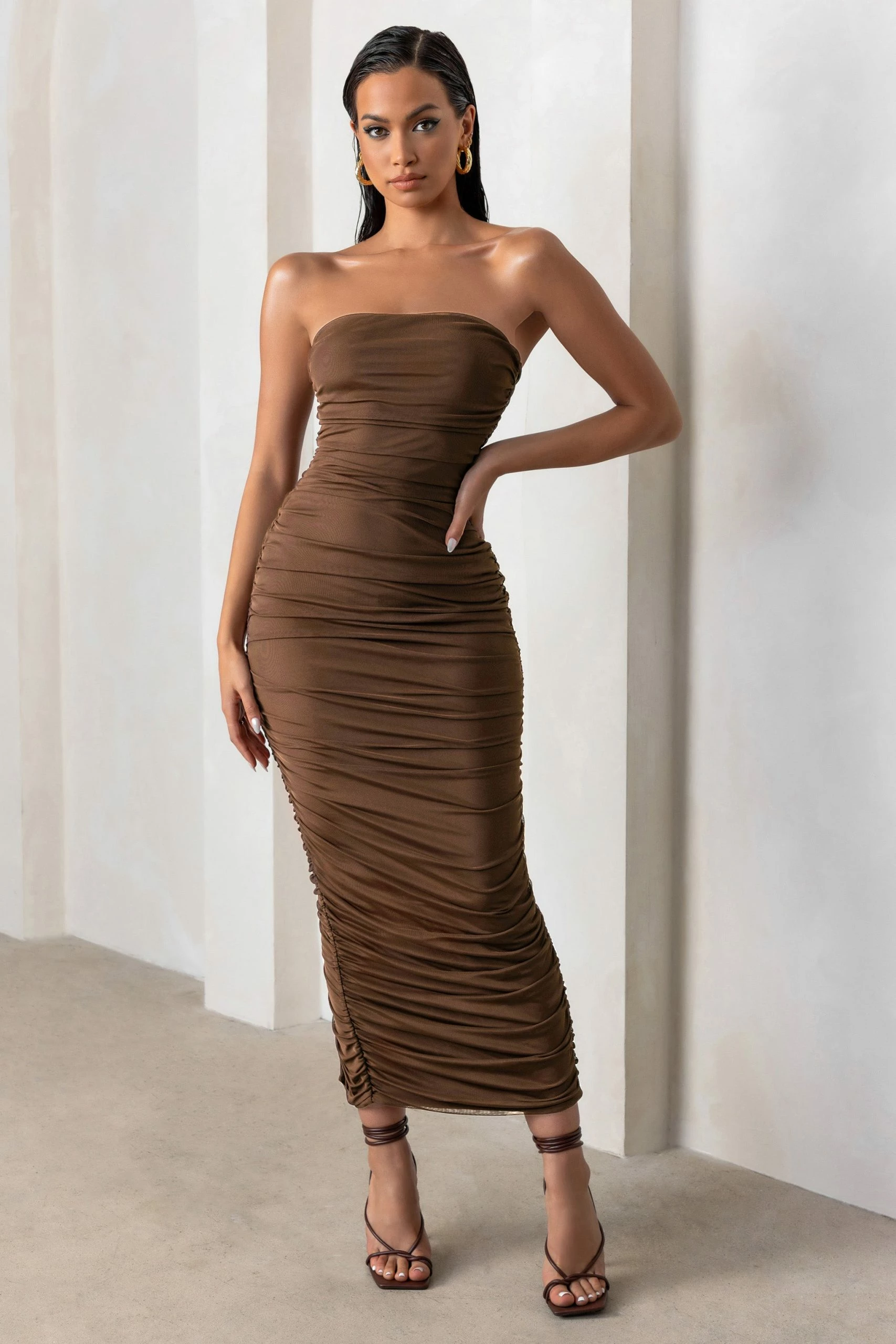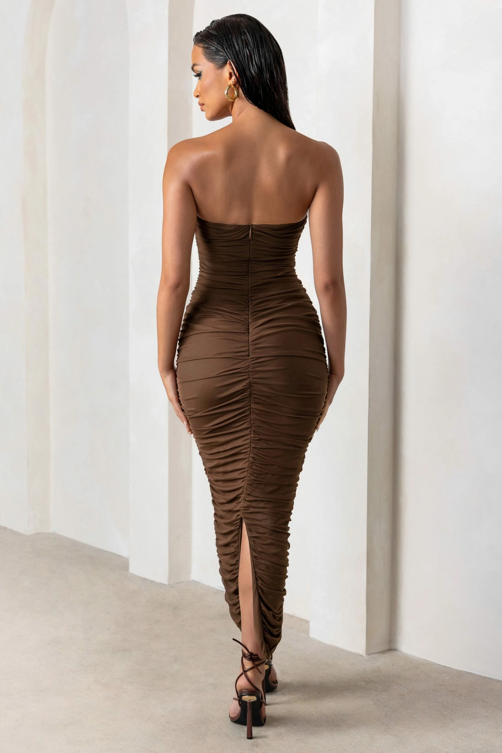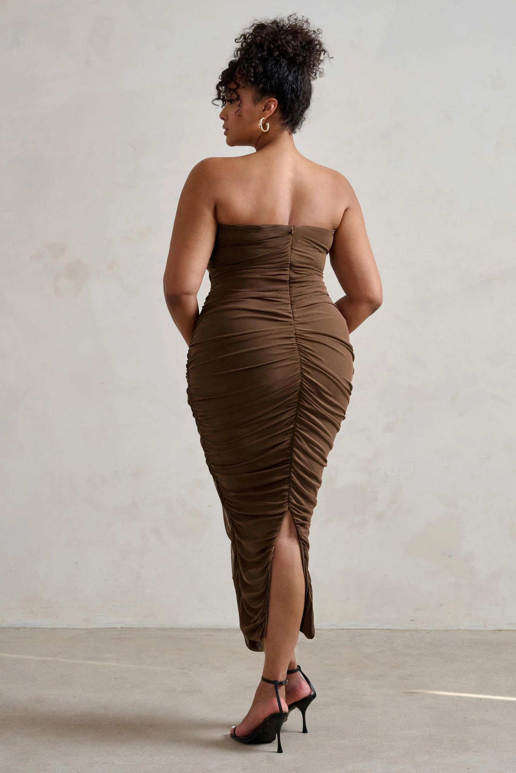 A chic strapless silhouette with a split hem defines our latest maxi dress, My Lady. Designed in a brown mesh fabric that’s fully ruched to enhance every curve, we picture this bandeau bodycon dress styled for the races but My Lady would turn heads at any special occasion you have upcoming.
