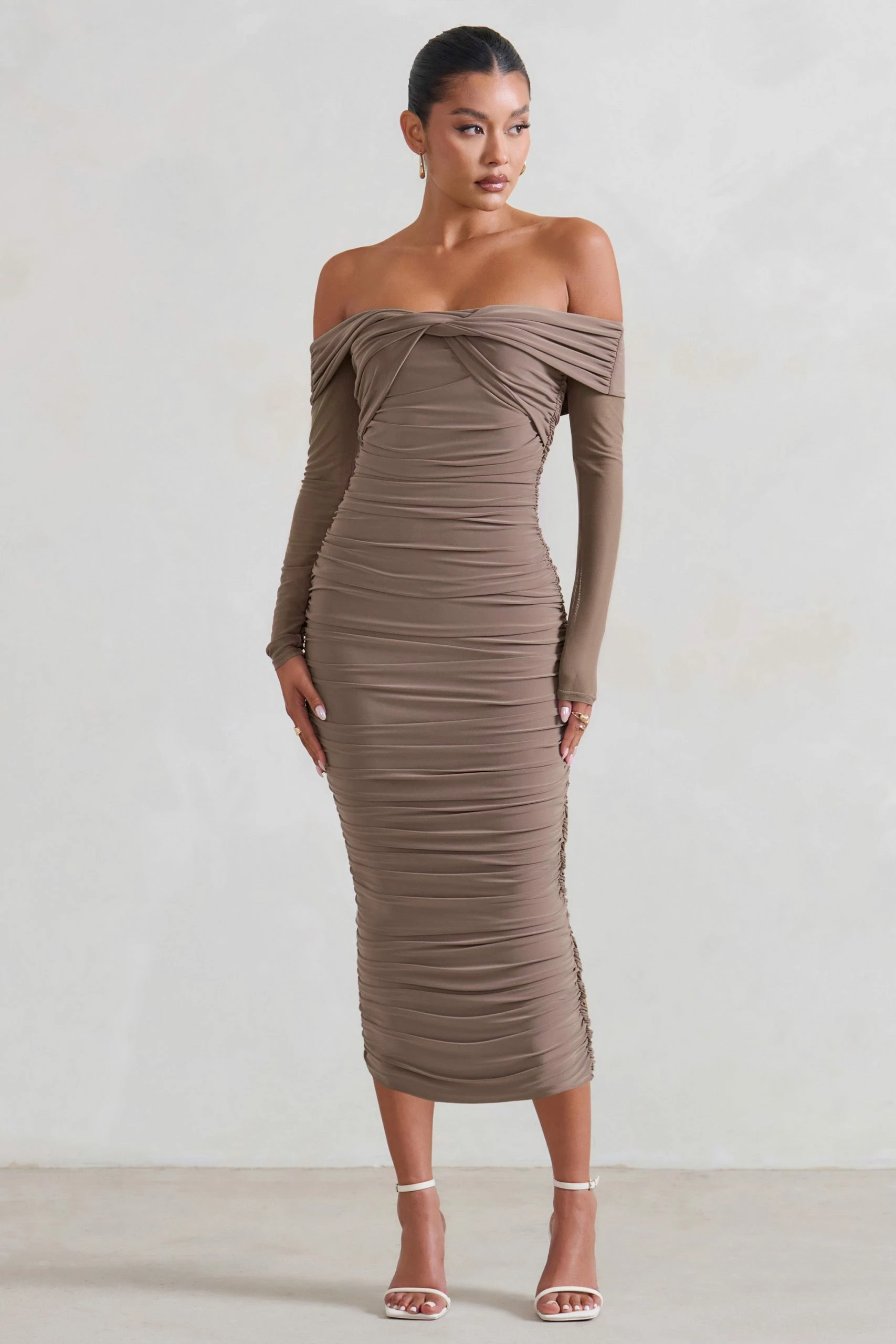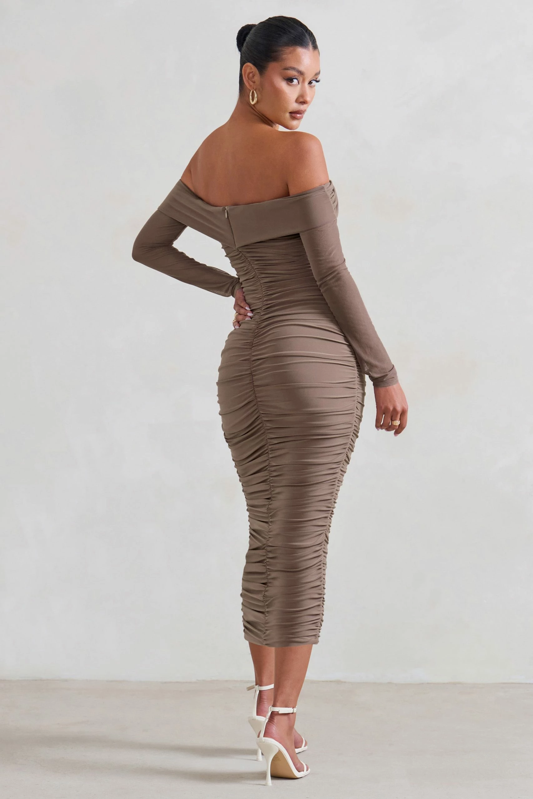A fine layer of mocha brown mesh adds a delicate touch to our darling Neva dress. Crafted from a luxurious double-lined jersey with plenty stretch to sculpt your silhouette, this midi dress boasts a twisted Bardot neckline, long sheer sleeves and ruching throughout. Pair our Neva with classic gold hoops for the prefect party ensemble.