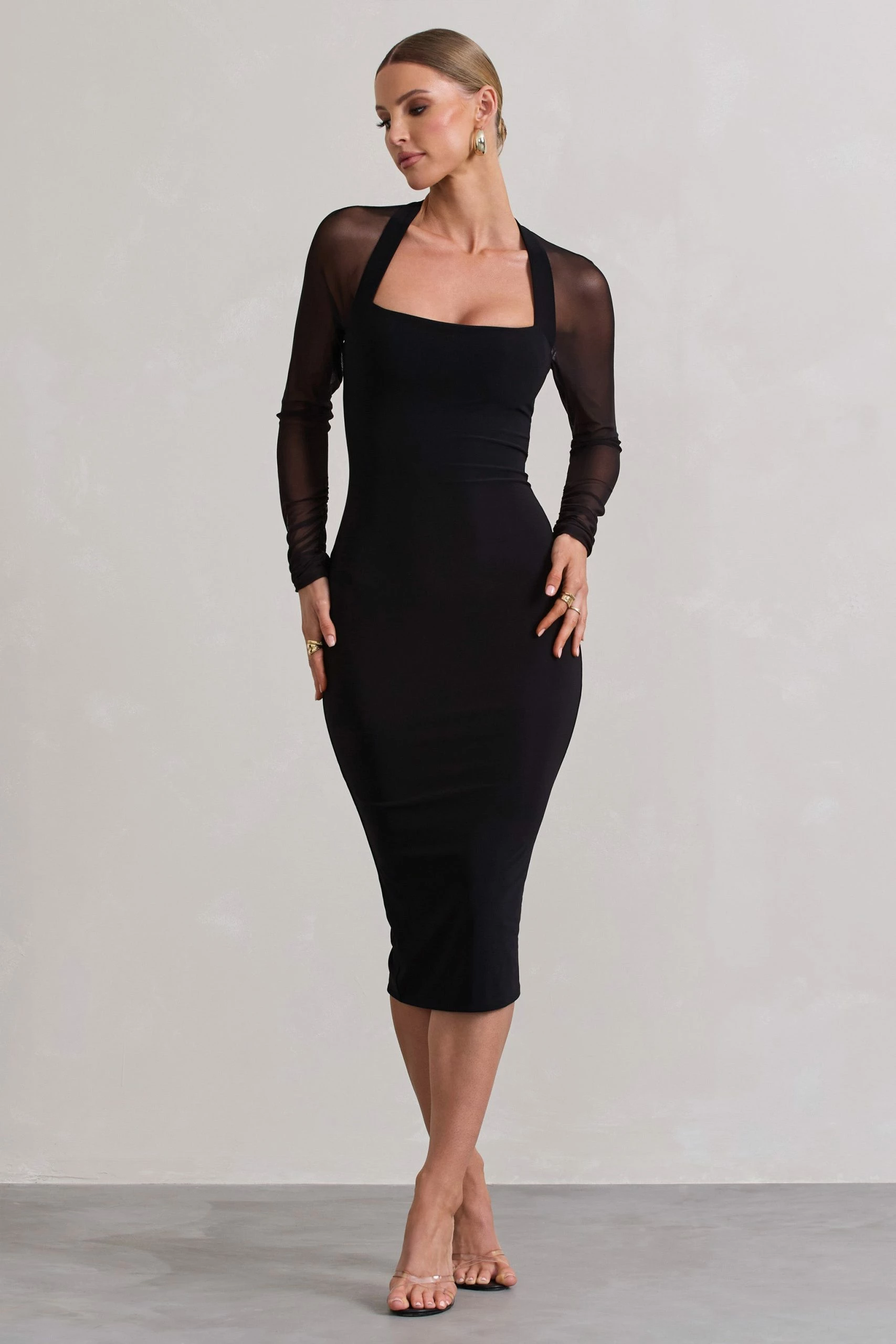 Get ready to wow in our latest black midi dress, Off Track. Crafted in a premium stretch jersey, this form-flattering piece is defined by contrasting sheer mesh sleeves and back. The combination of these features create an elegant option for cocktails, dates and formal events – especially when paired with some heels like Oh Please.Â