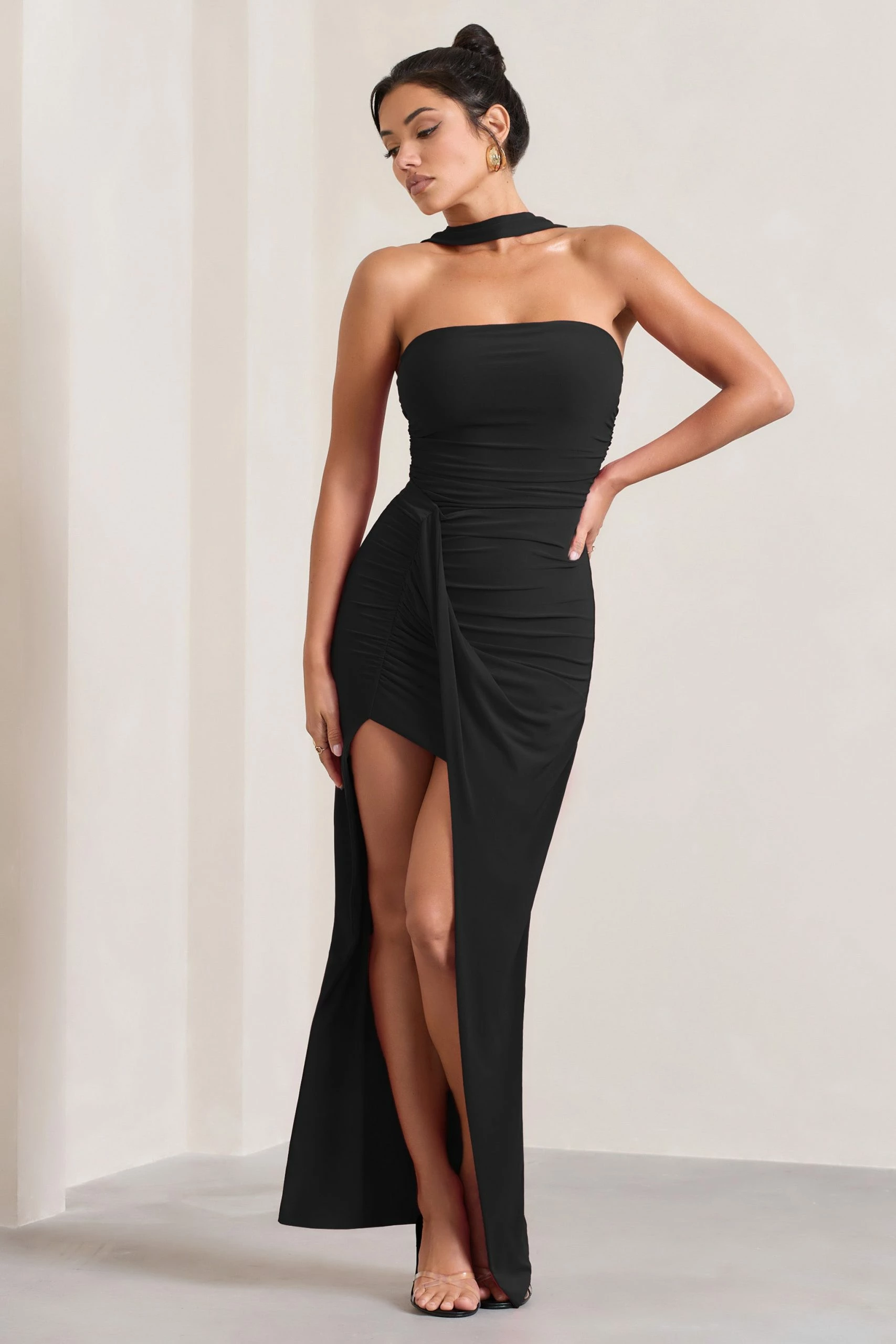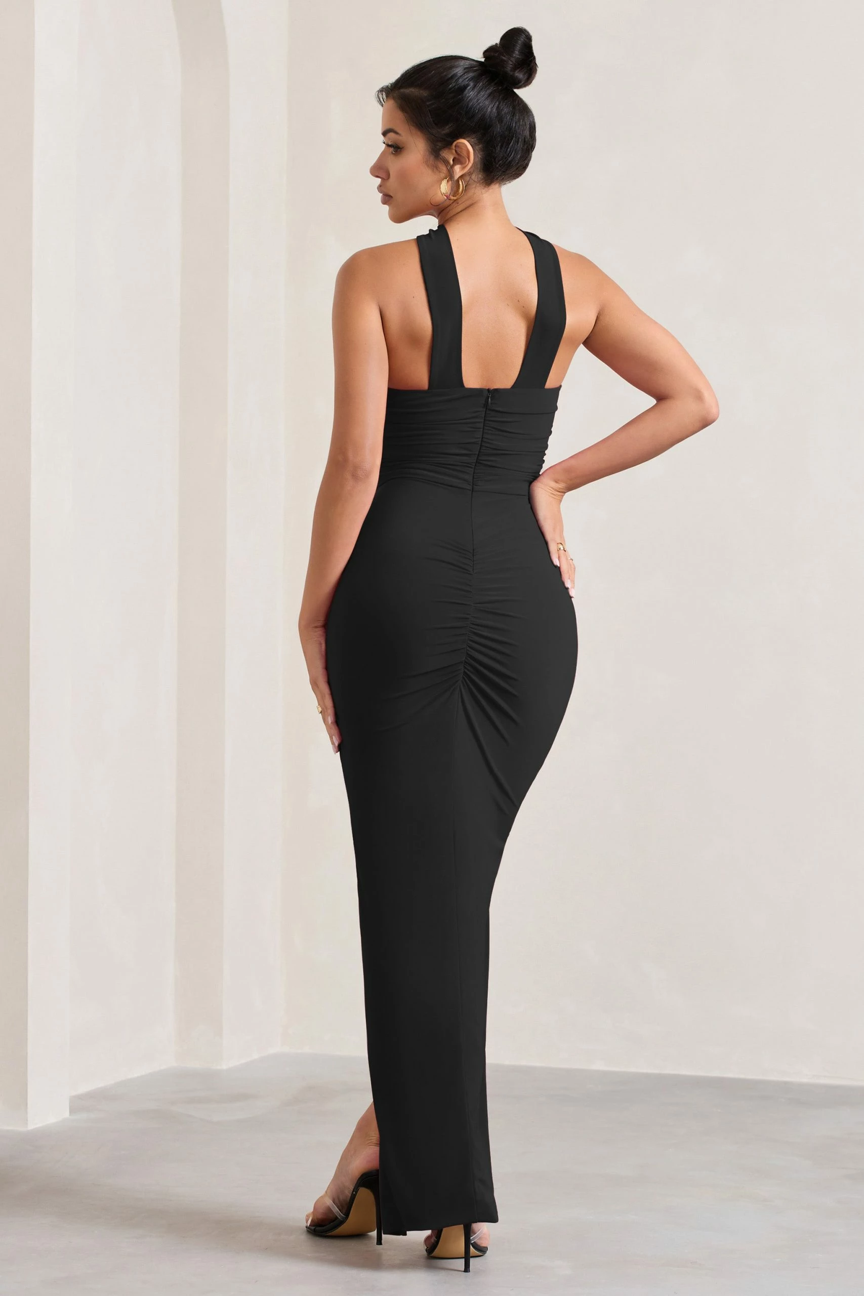 Add a hint of spice to your formal wardrobe this season with our ruched maxi Paprika. Crafted in a premium classic black jersey, this piece features a high leg split and twist detail, finishing with an elegant halter collar. Paprika is the perfect option for any upcoming black tie event or wedding.