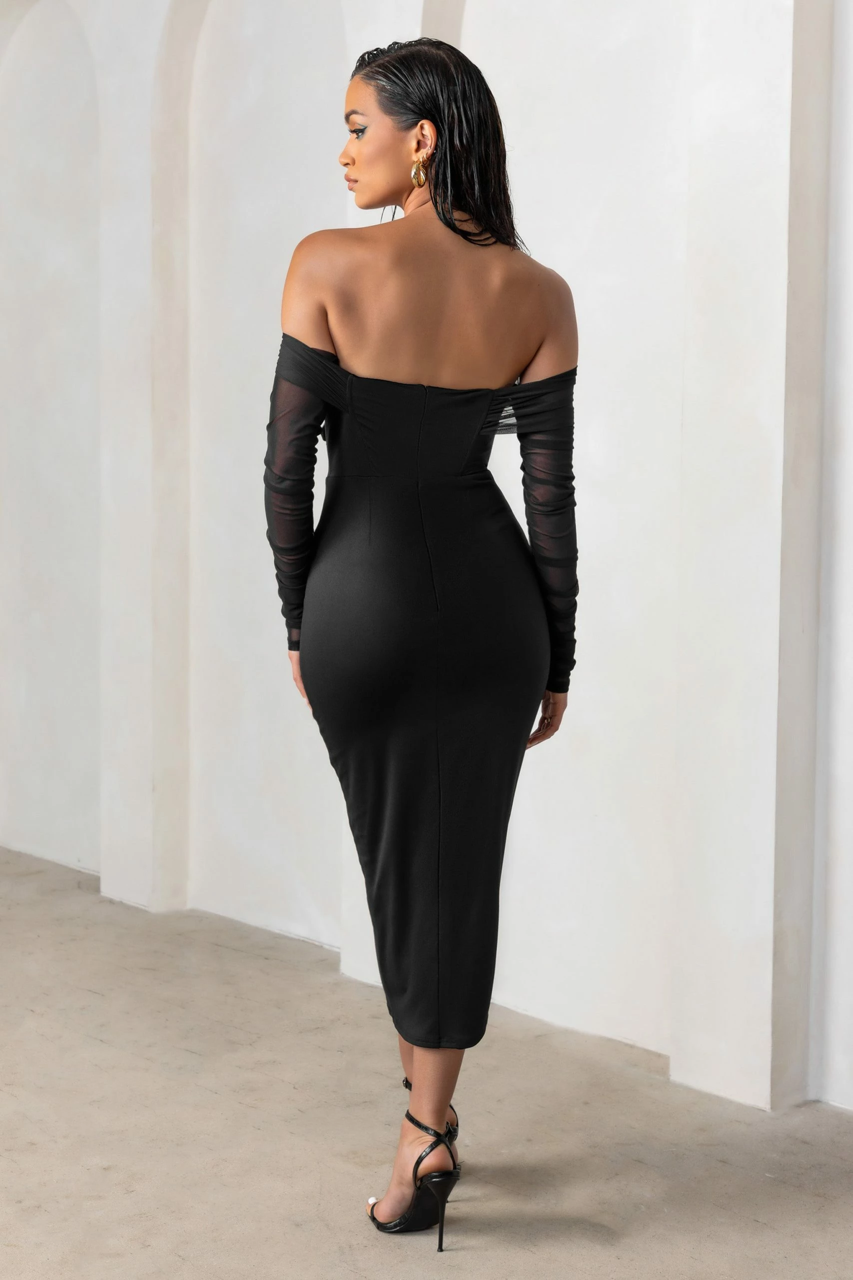 Classic silhouettes that are designed to stand out, that’s what our Precious Treasure midi dress is all about. Featuring a sophisticated bardot neckline to reveal your feminine decolletage, delicate mesh sleeves, and a waist-cinching corset bodice with bold buckle detail, this midi will be your new go-to for special events. Carefully designed with our premium crepe fabric in a classy black shade, this dress is the perfect look for your next cocktail night, special occasion or glam night out. You’ll be an icon with this daring design!