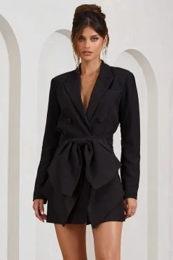 Delight every guest at that upcoming wedding or special event in our bow-embellished blazer dress, Prized. Made to rival any party gift, this LBD comes tailored in a double-breasted silhouette closed by four covered buttons. We’d prefer to style this black mini dress timelessly with strappy stilettos and a few gold accents.
