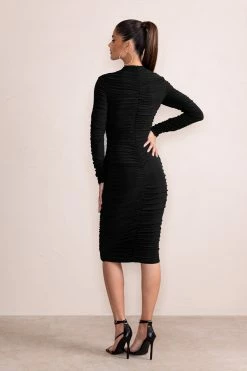 Peyton | Black Ruched Cut Out Bodycon Midi Dress With Long Sleeves