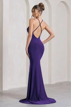 Kate | Navy Square Neck Maxi Dress With Plunge Back And Side Thigh Split