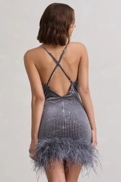 Mirror Me | Silver Velvet Embellished Cowl-Neck Mini Dress With Feather Trim