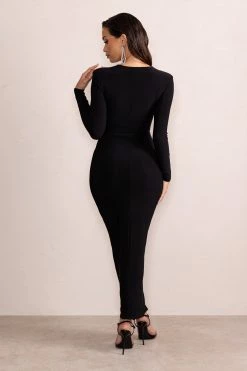 Peyton | Black Ruched Cut Out Bodycon Midi Dress With Long Sleeves
